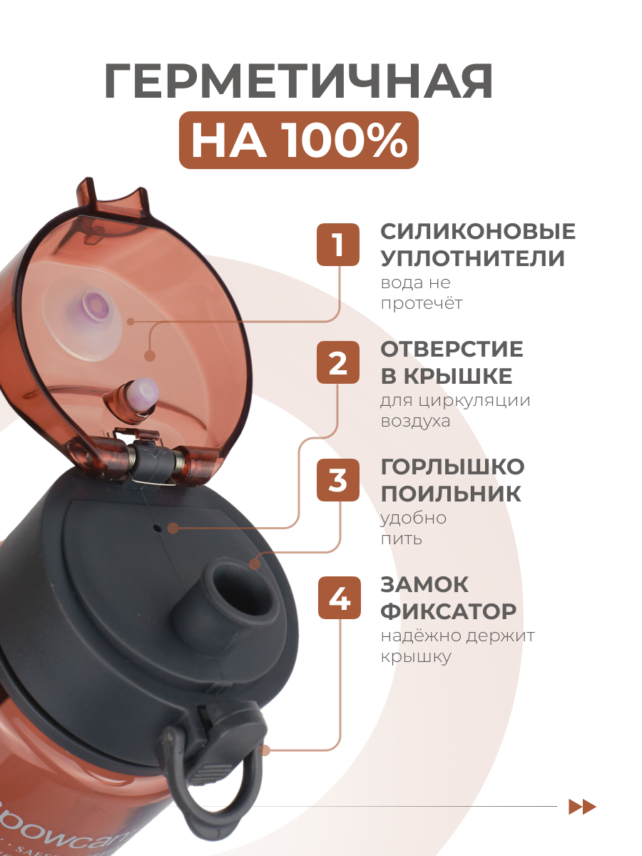 При нажатии на кнопку, после того, как отстегнешь защелку, крышка открывается сама как на пружине. В горлышке есть дополнительное отверстие для доступа воздуха, очень удобно когда пьешь, давление регулируется через это отверстие и вода спокойно поступает из основного горла |