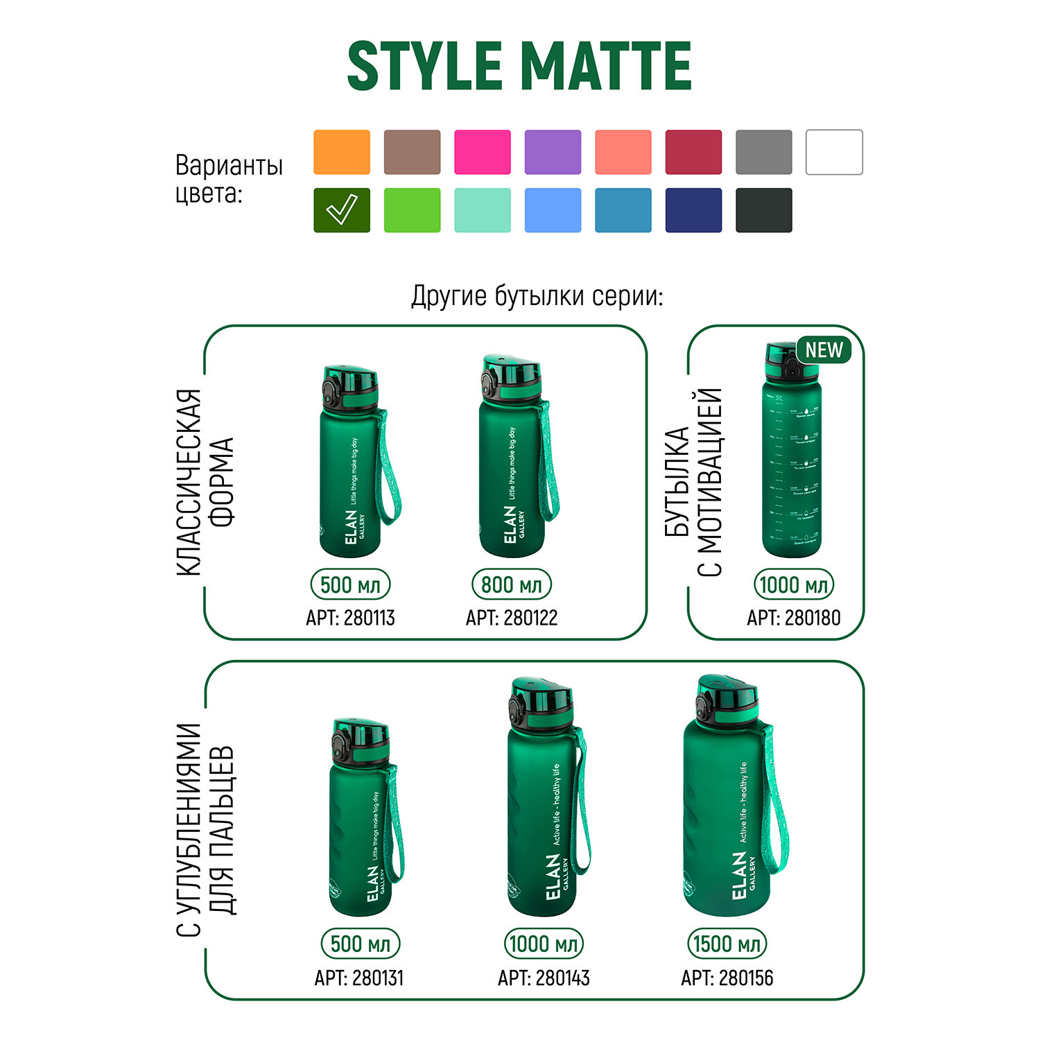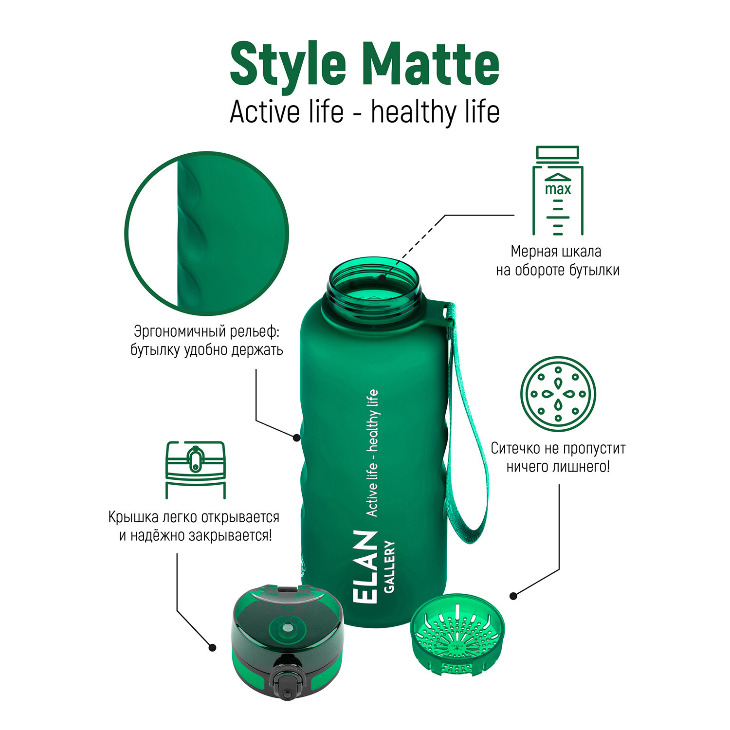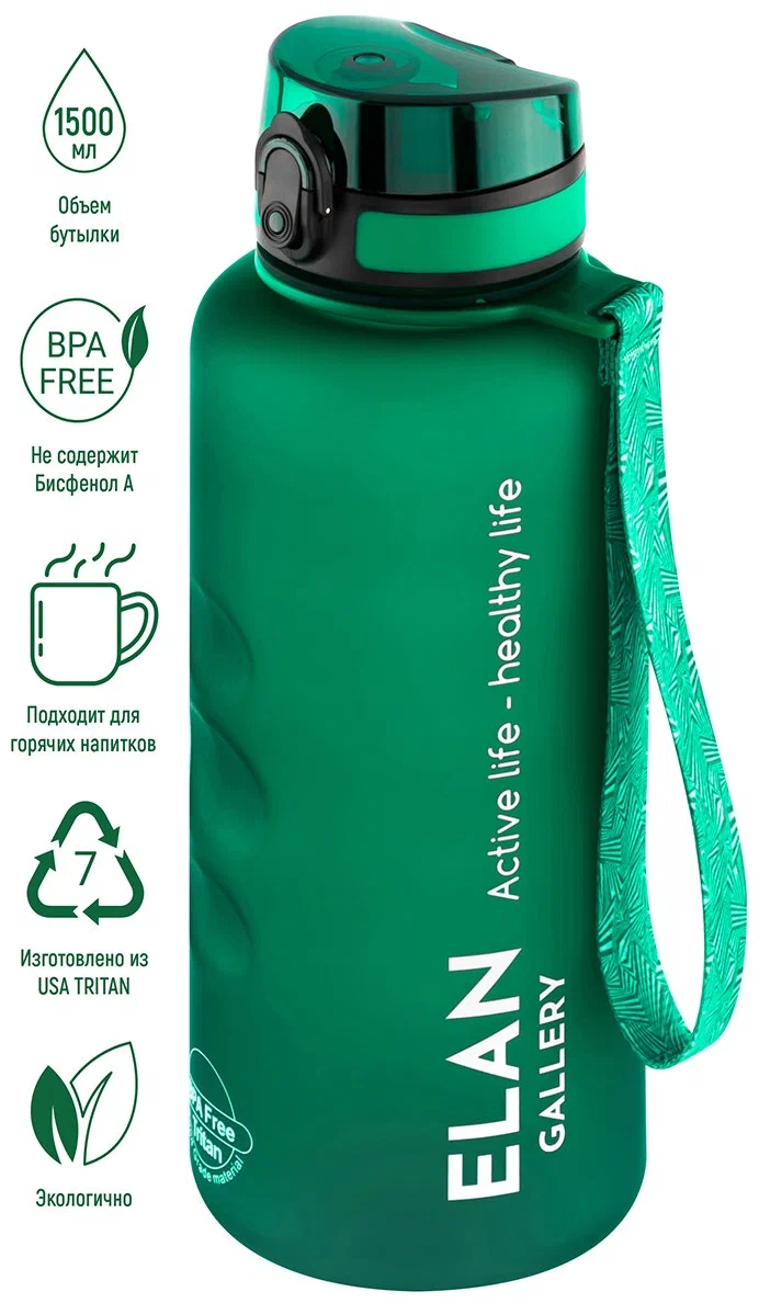 Бутылка для воды 1,5 л 10х10х28,5 см Elan Gallery Style Matte, с углублениями для пальцев, темно-зеленая интересное: