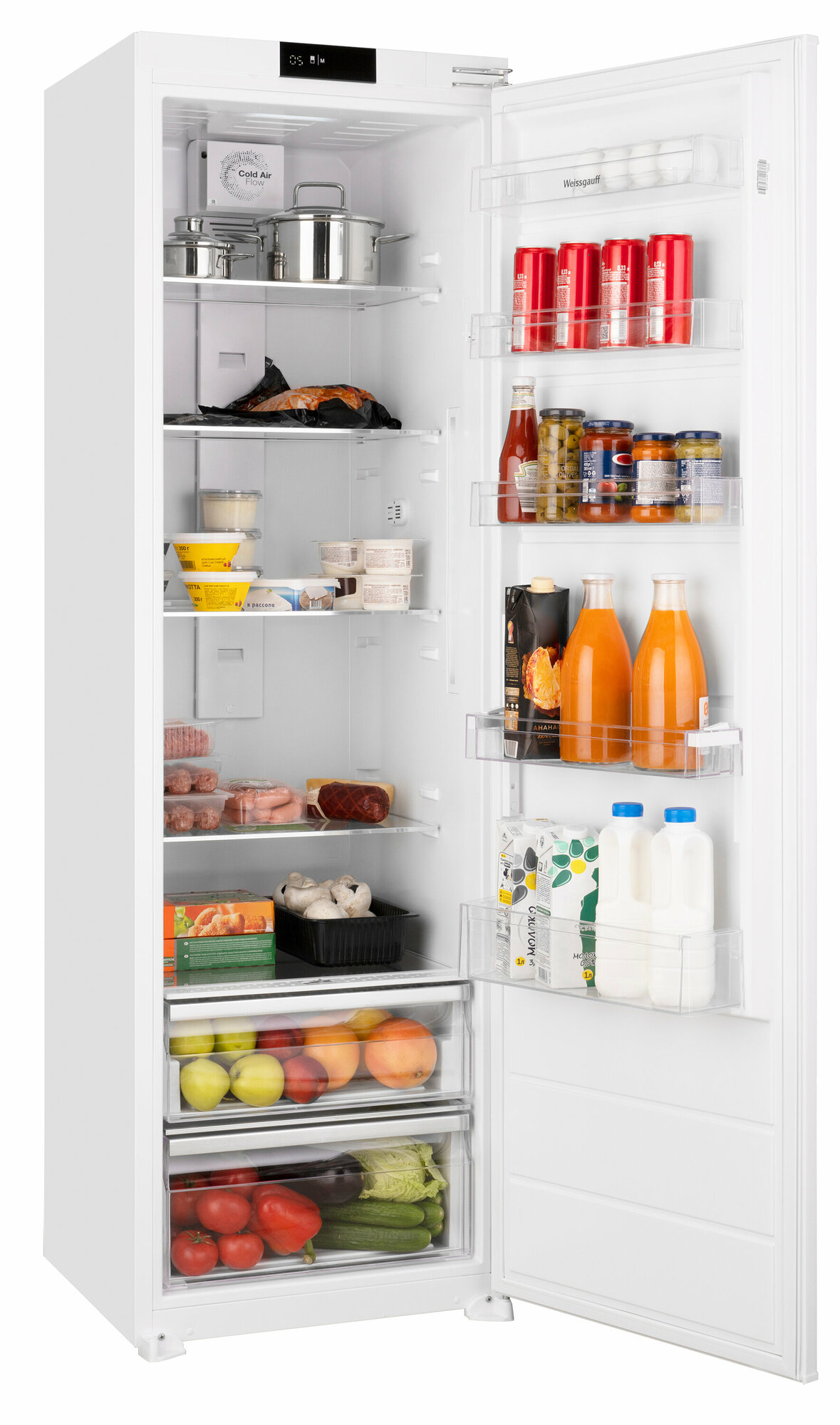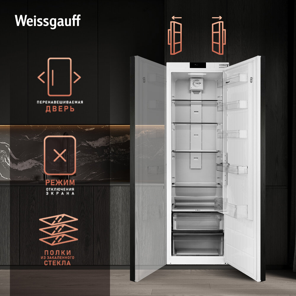 Встраиваемый холодильник Weissgauff WRI 178 Fresh Zone, 3 года гарантии, без морозильной камеры, высота 177 см, ширина 54 см, объем 300 л, зона свежести, полностью электронное управление, супер-режим, LED-освещение, полки из закаленного стекла, А+