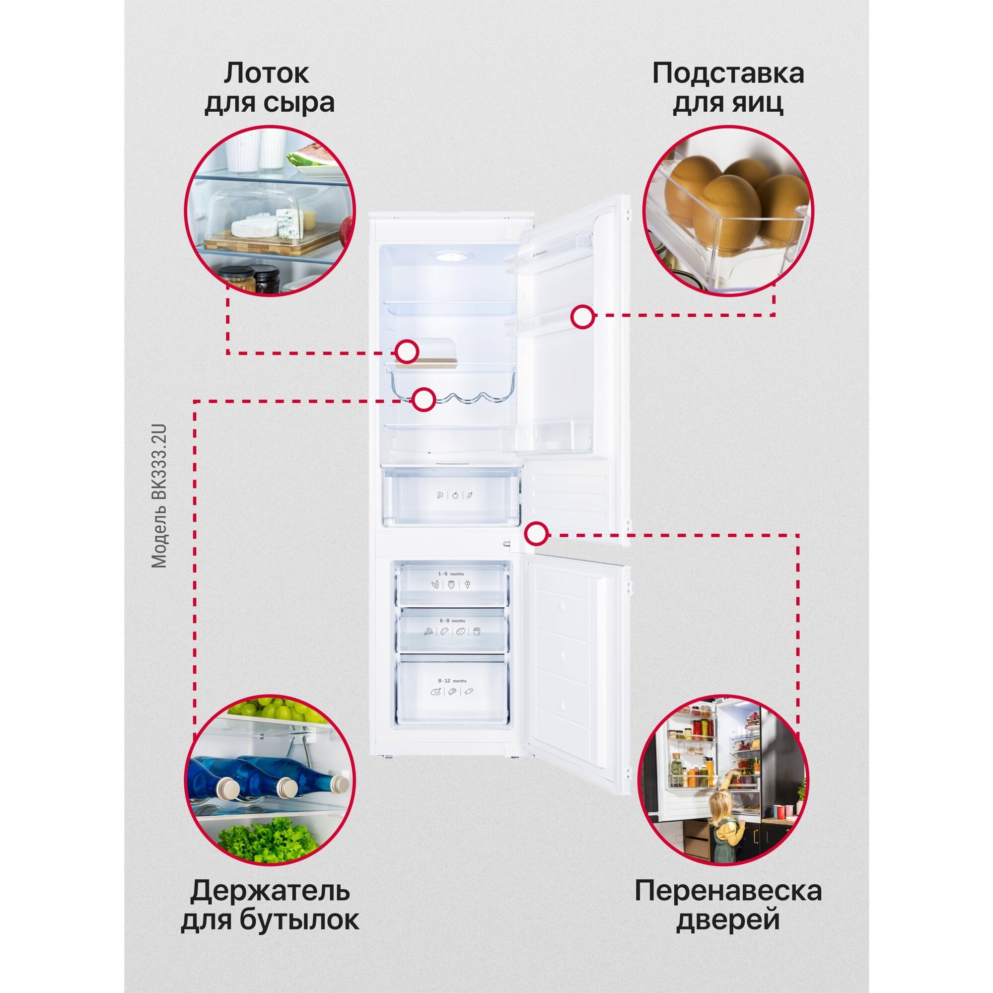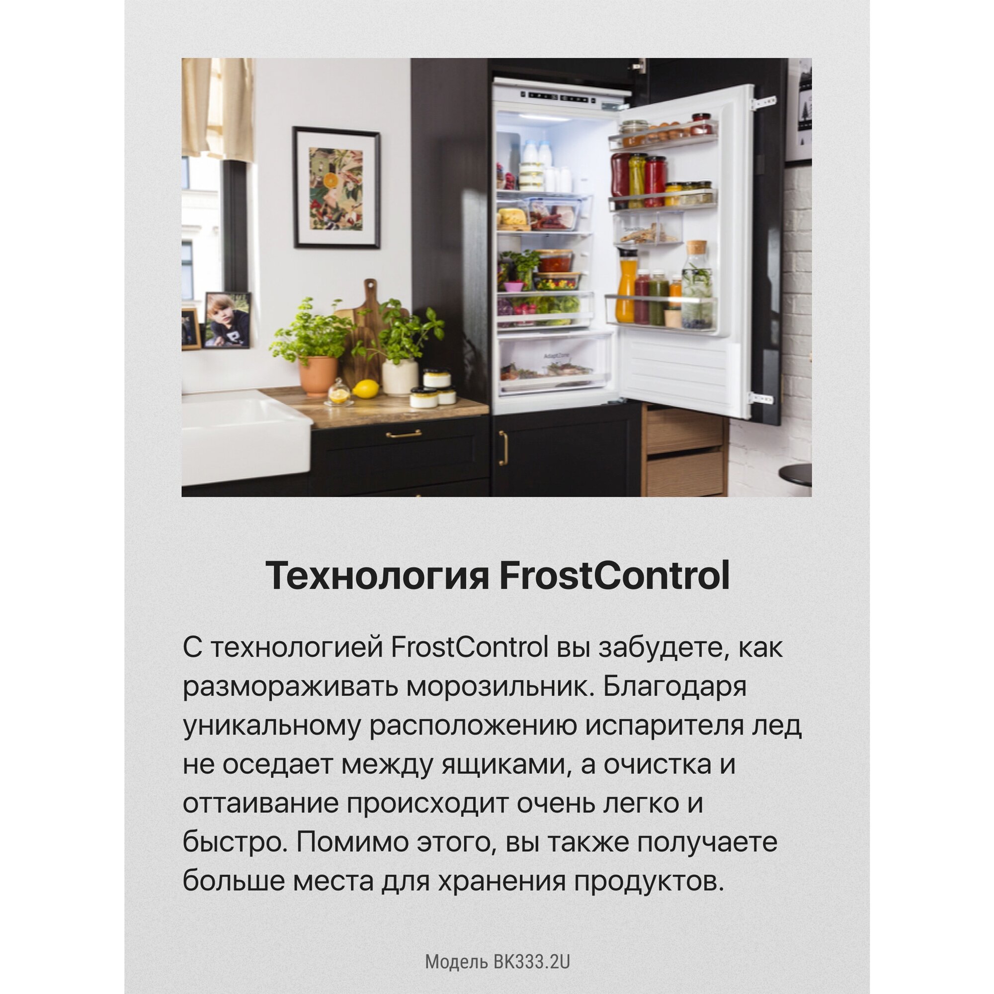 | Дополнительная информация | длина шнура 220 см; подсветка LED; материал полок: закаленное стекло; регулировка термостата; контрольная панель располагается внутри; тип крепления фасада слайдерное; комплектация морозильной камеры: 2 полки, 3 ящика; комплектация холодильной камеры: 4 основных полки, 3 боковые полки на двери, 1 ящик для овощей, держатель для бутылок, подставка для яиц, форма для льда, лоток для сыра |