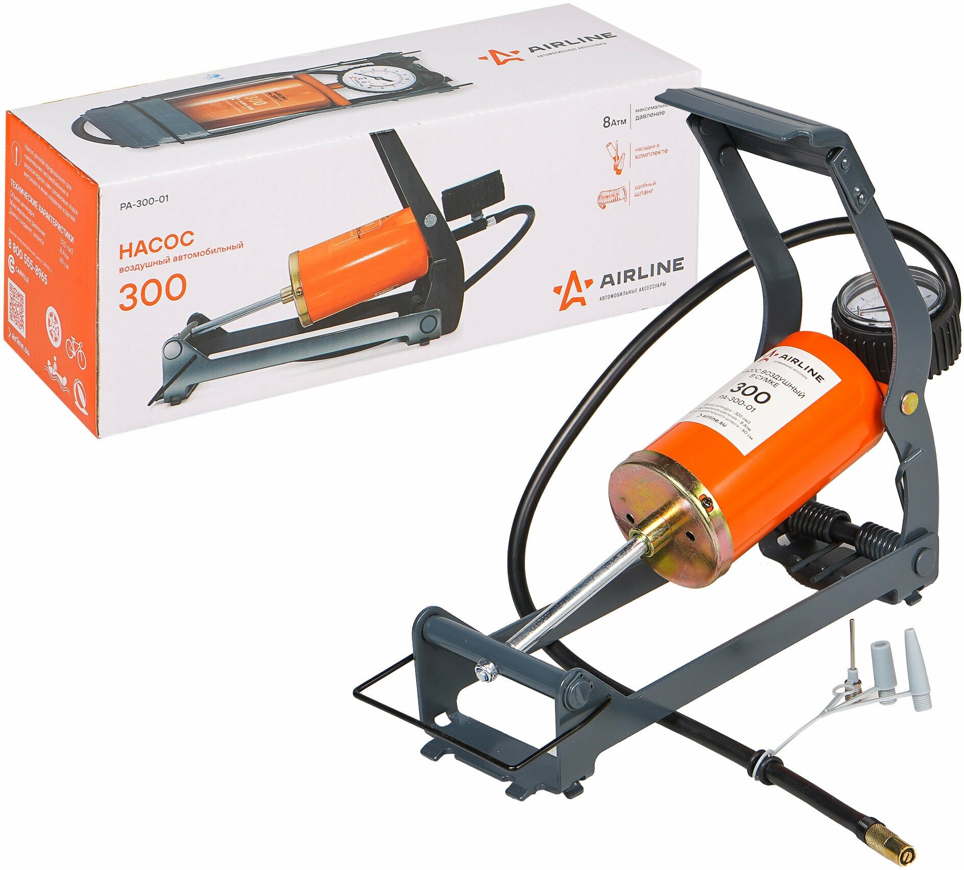 Насос автомобильный Airline, объем 300см³, давление до 8атм, длина шланга 60см, съемный манометр
