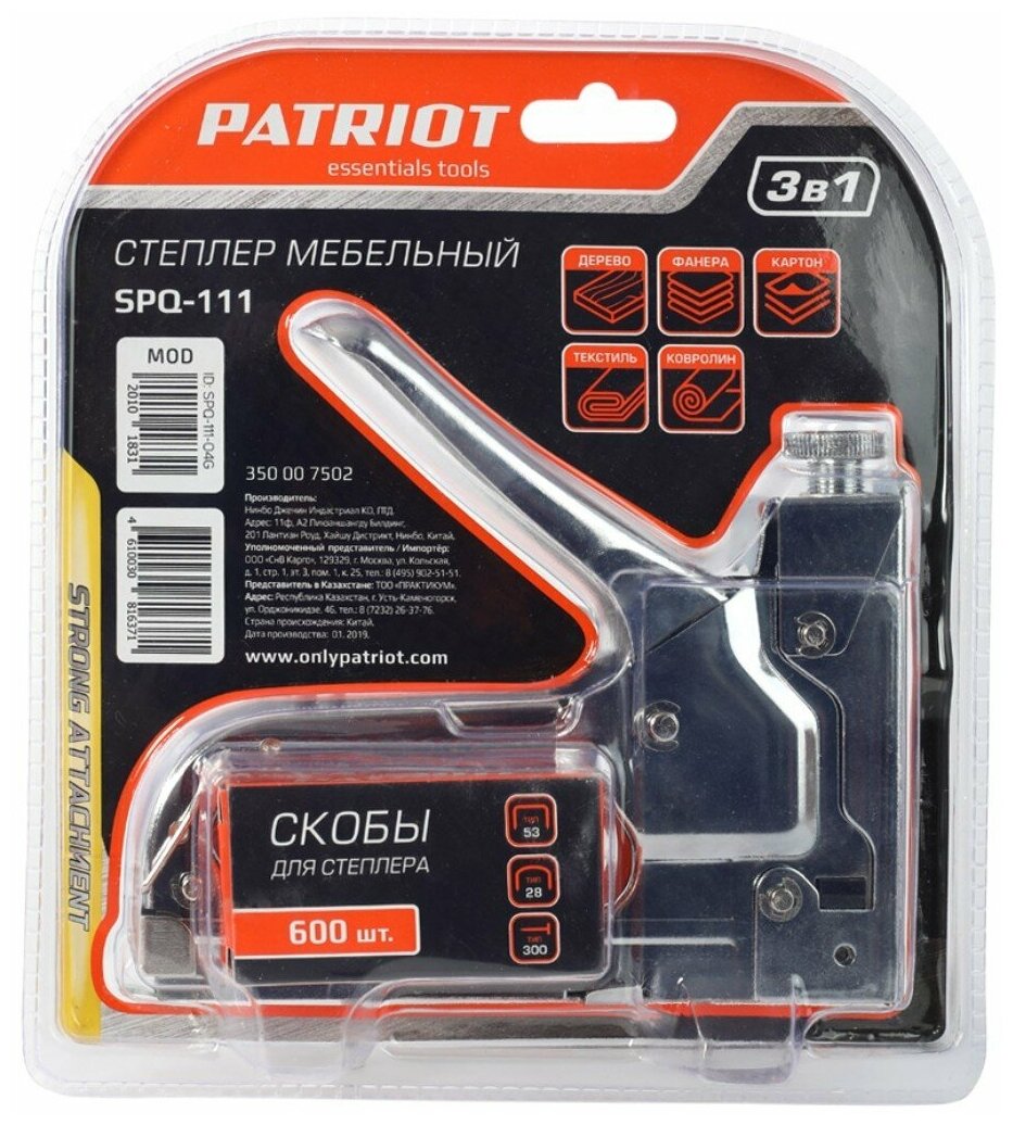 Степлер Patriot 3 в 1, скобы №140, 4-14 мм, скобы №28, 10-12 мм, гвозди №300, 600 шт в комплекте (SPQ-111)