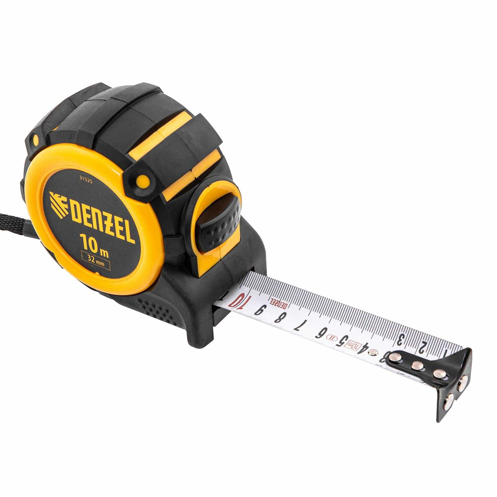 Рулетка Denzel 10м х 32ммавтоматич. фиксац., нейлон. покрытие, магнит. зацеп, двухстор. разметка 31525