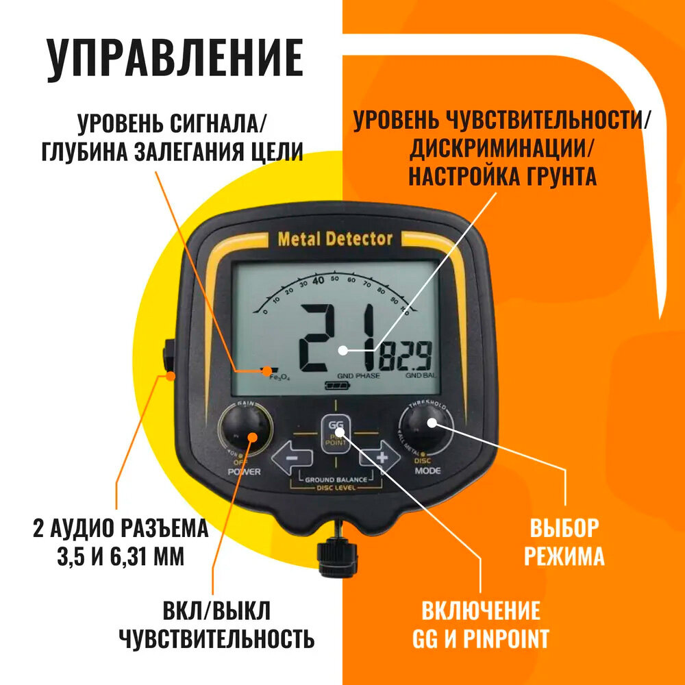 | Дополнительная информация | Баланс грунта, отстройка от электропомех, цифровая идентификация, индикатор минерализации, способность работать на сложных грунтах вплоть до соленых пляжей, стандартные разъемы для наушников 1/8” и 1/4“ |