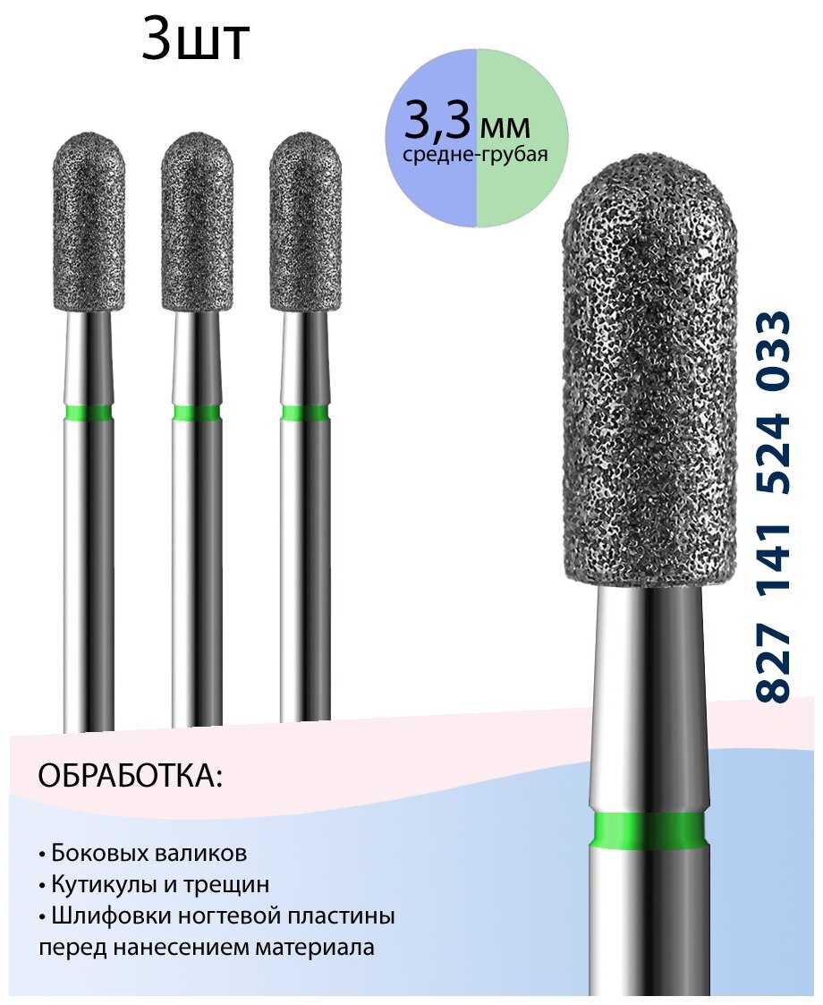 Фрезы для маникюрного аппарата набор алмазных насадок цилиндр для безопасной обработки кутикулы 827 141 514 033 Тонкая-Средняя (упаковка 3 шт)