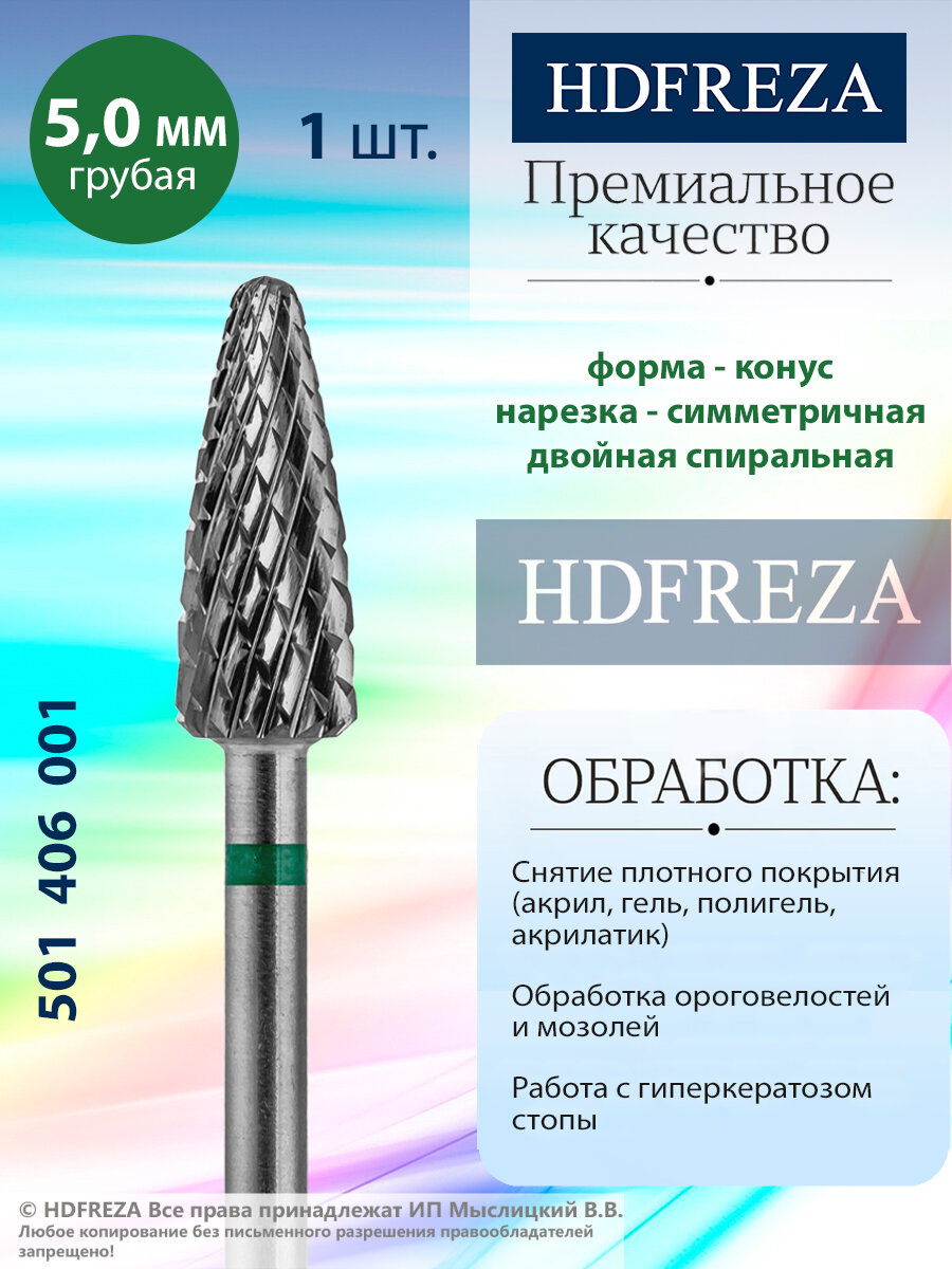 HDFREZA Фреза для маникюра и педикюра твердосплавная 501 406 001 Грубая зеленая конус (кукуруза) d-5.0 интересное: