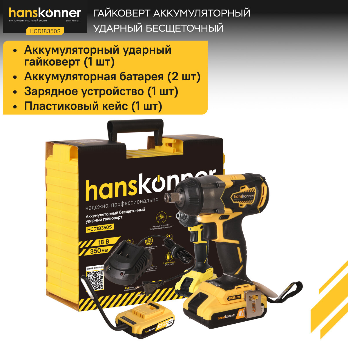 Ударный гайковерт Hanskonner HCD18350S, 18В, 350Hm, 2акб, кейс