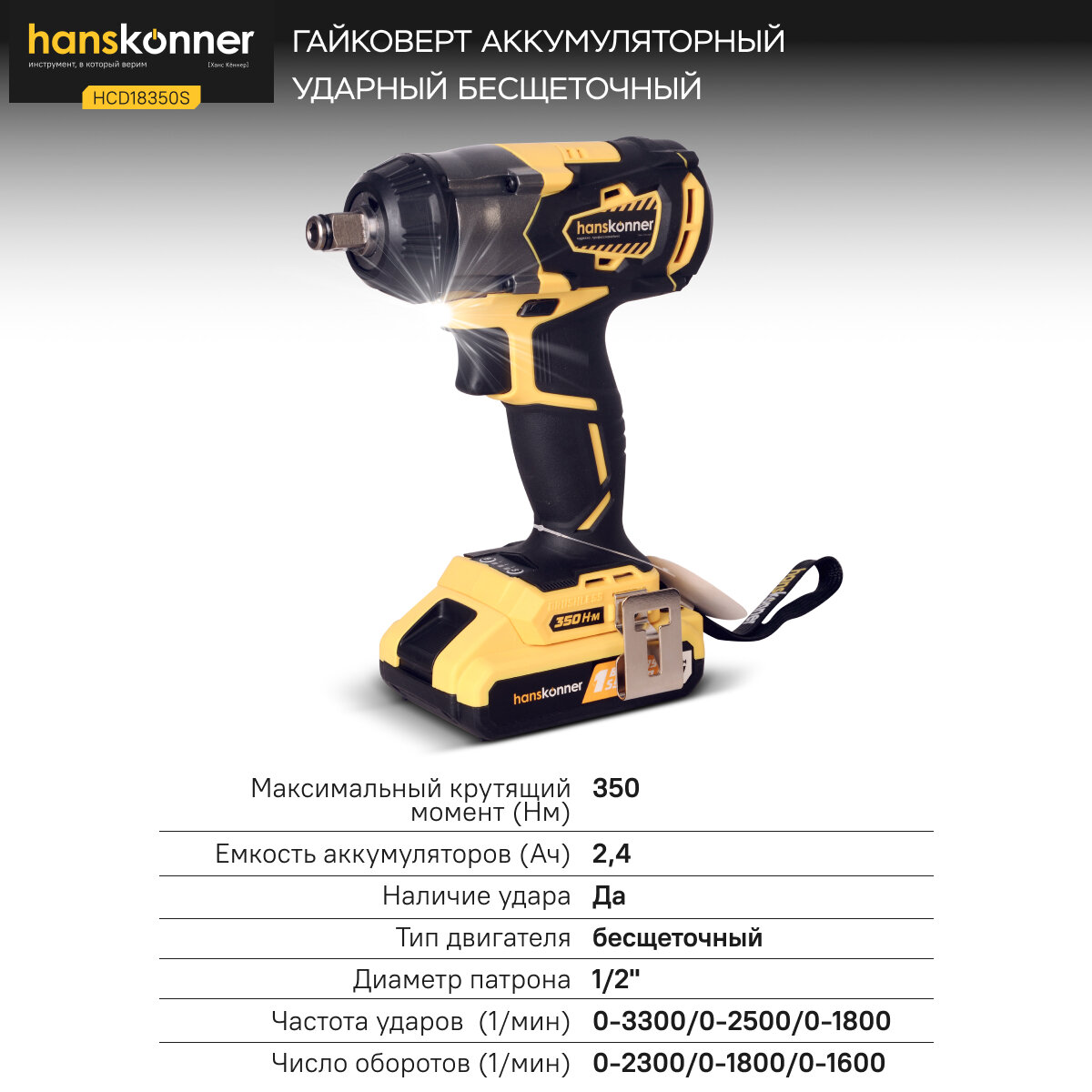 HCD18350S Гайковерт ударный.б/щ,Hanskonner 18В,3скор,2акк Li-Ion 2,4Ач,350Нм,1/2",зар 1ч,OneBat