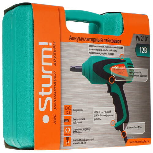 Гайковерт электрический Sturm! IW2101 ударный, работа от прикуривателя 380Нм, реверс, провод 3.5м, LED подсветка рабочей зоны, 2 ударные головки 17-19мм/21-23мм, 2 предохранителя 15А, пластиковый кейс