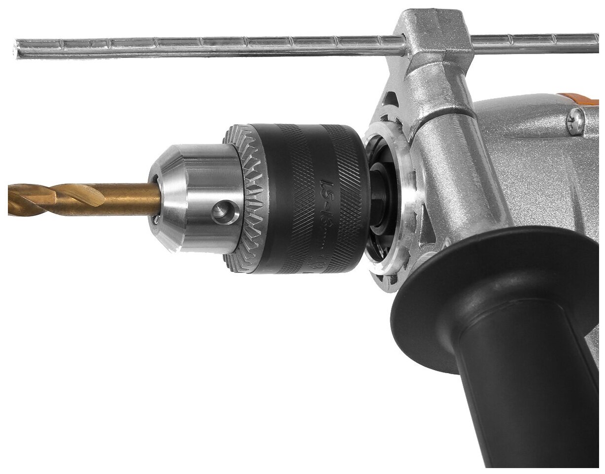 Корпус из металла и ручка (очень жестко стоит). Патрон надежный зубчато-винтовой. Ручка основная и дополнительная с резиновыми накладками. Крутящий момент хороший, можно спиральным сверлом работать |