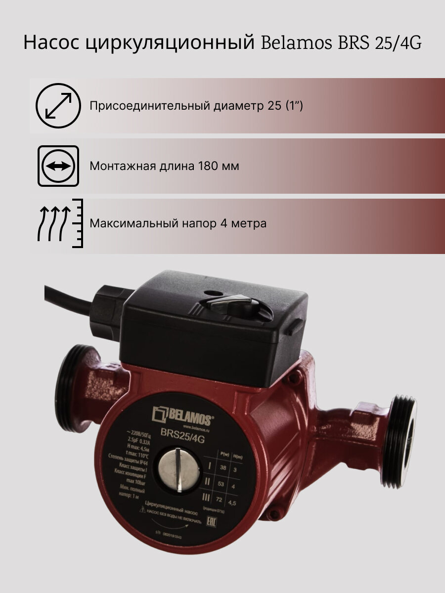Циркуляционный насос для систем отопления Belamos BRS25/6G (25/6g) DN25 подъем 6 м 180 мм