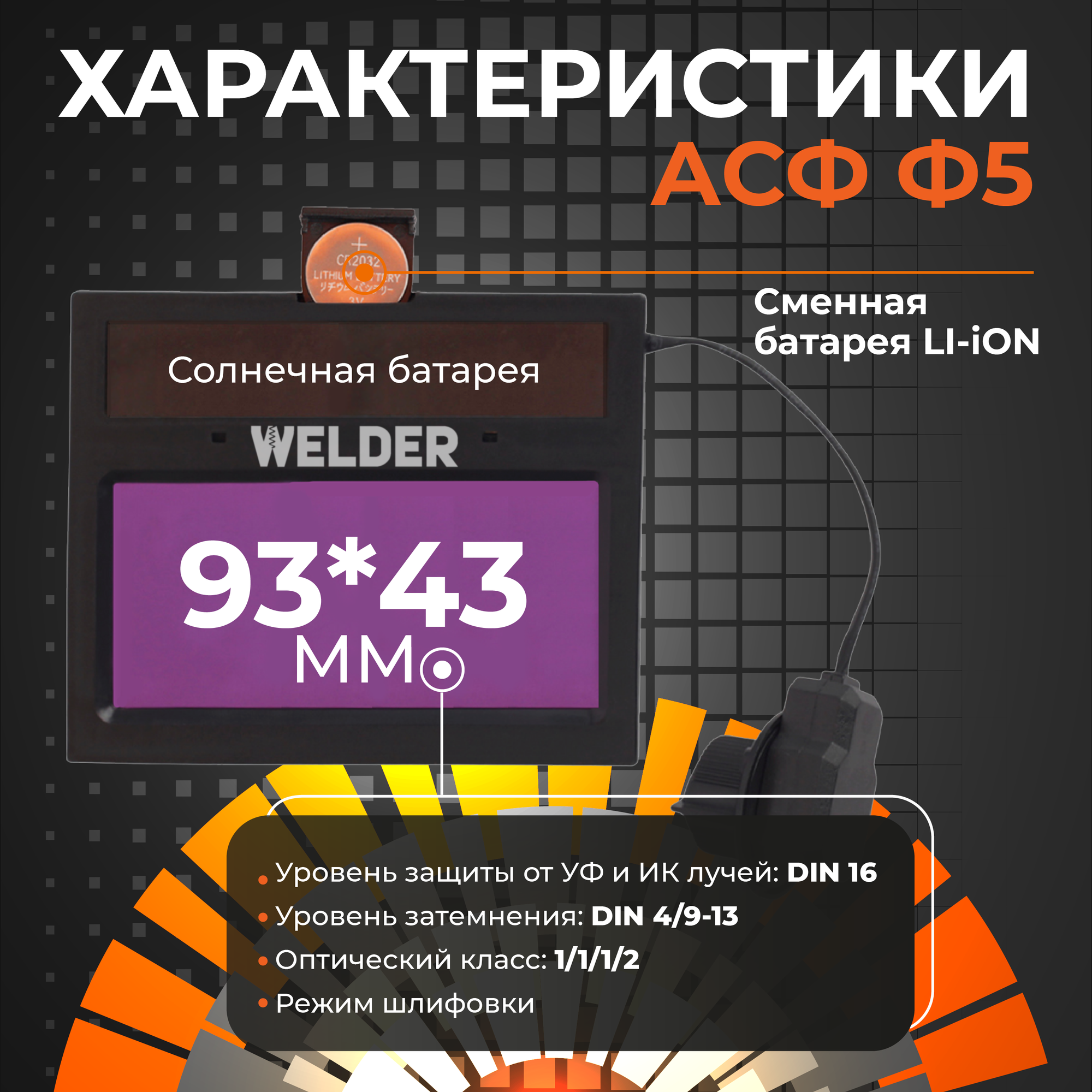 Маска сварочная WELDER PRO Ф5 Хамелеон 93x43 мм, DIN 4/9-13 (Внешняя регулировка), матовая, в коробке интересное: