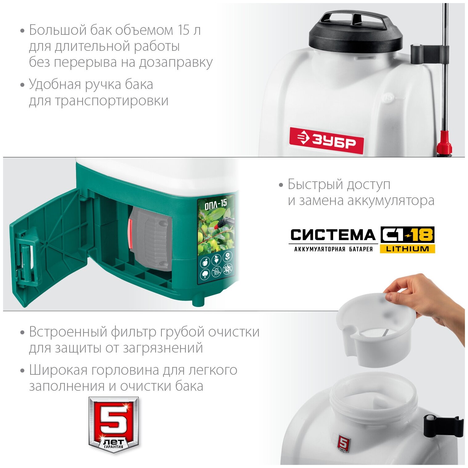 ЗУБР 15 л бак, без АКБ, опрыскиватель аккумуляторный, Li-Ion 18В ОПЛ-15