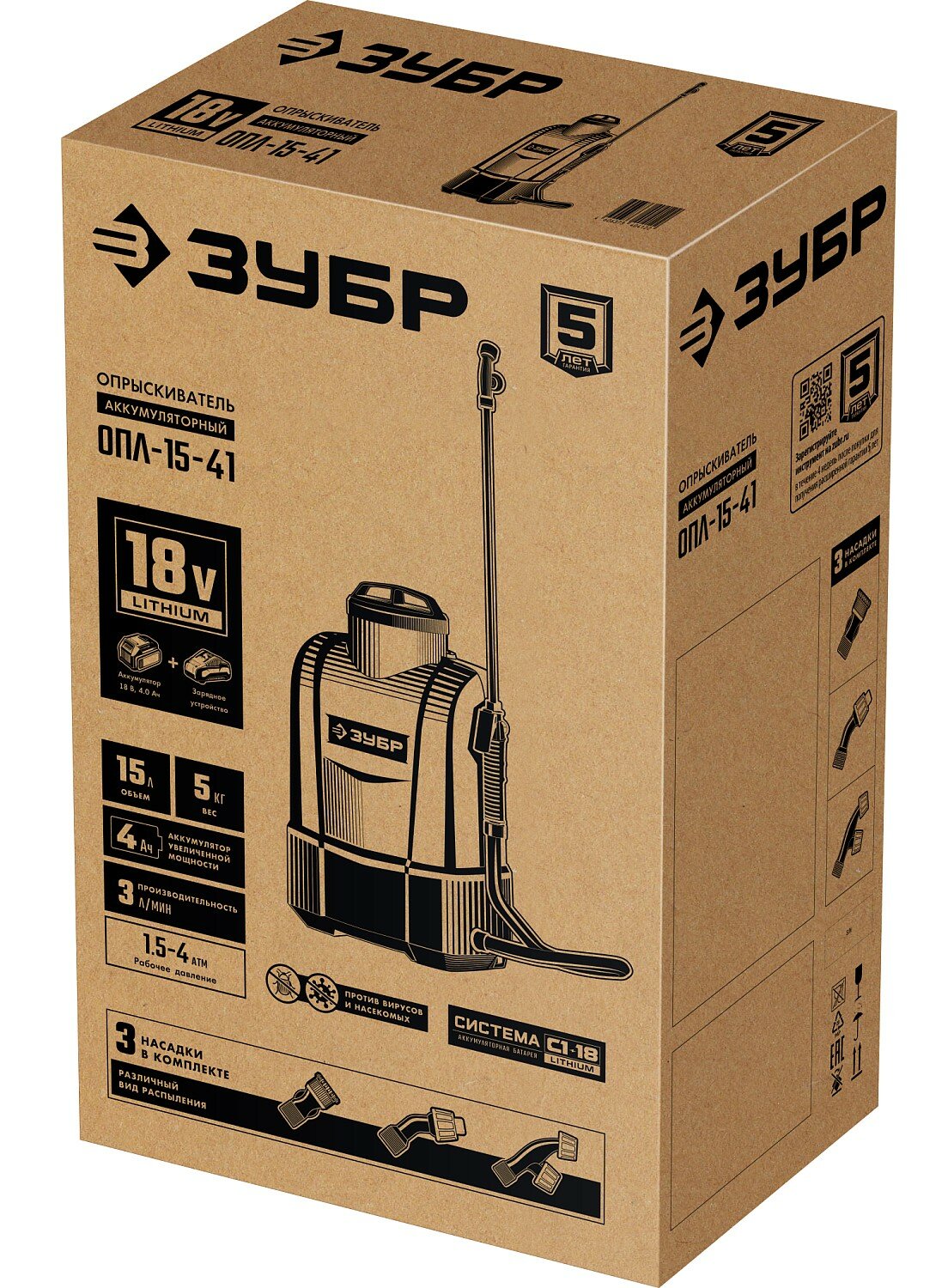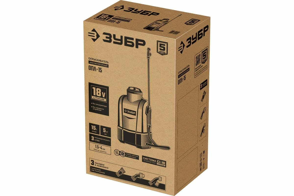 Зубр Опрыскиватель аккумуляторный Li-Ion 18В, 15 л бак, 1 АКБ ОПЛ-15-41 .