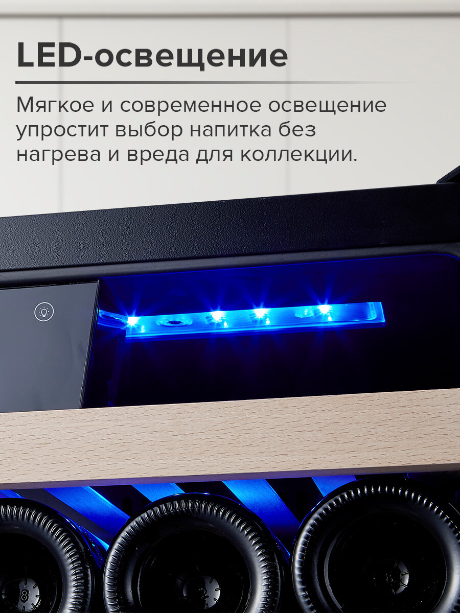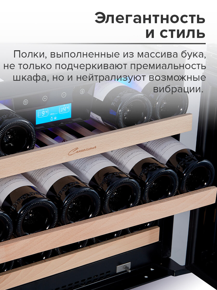 - качество деталей -- поехавшие буквы в логотипе, неровные дощечки полок - уровень шума (заявлен 41 дб, рядом стоит холодильник 42 дб, который практически не слышно рядом с этим шкафом). Шумомер спереди на расстоянии 0.5м показывает 46 дб. - бутылки с более широким телом (например, бургундские) не поставить на 2ой ряд, если что-то лежит на верхнем, слишком маленькое расстояние. Да и на самый верхний ряд почти все бутылки идут в плотную, сдирается этикетка - полки без каких-либо роликов, просто волочатся по направляющим |