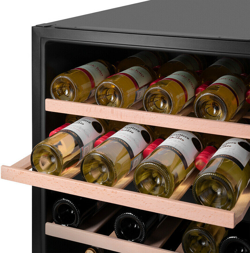 | Плюсы: | Хорошее качество сборки. Работает шкаф тихо. Температуру держит точно, что важно при длительном хранении вина. Полки деревянные, гасят вибрации. |