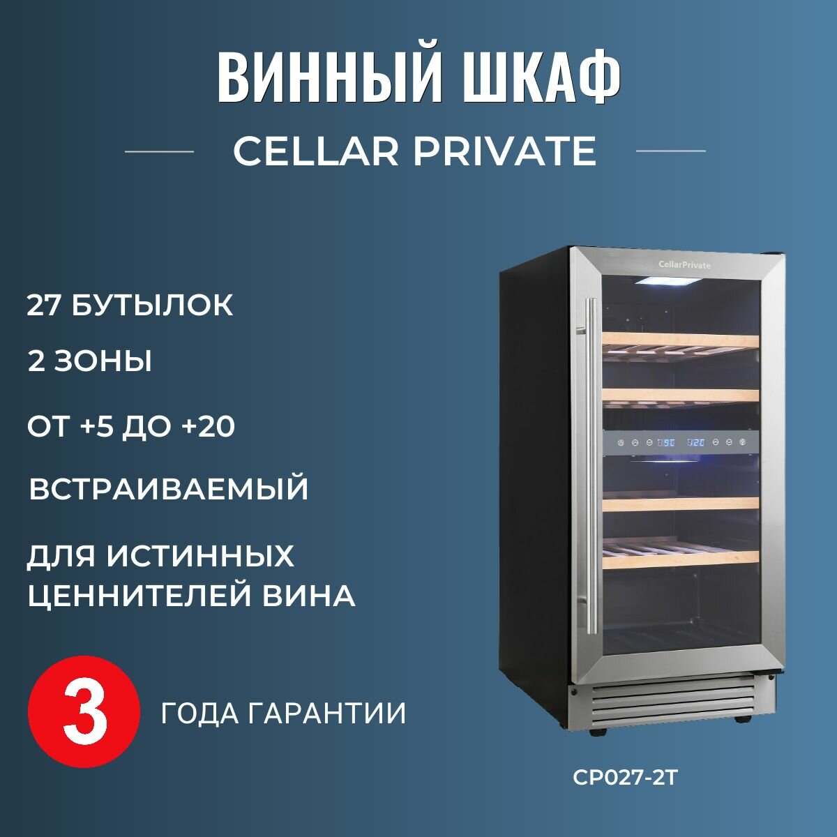Винный шкаф Cellar Private CP027-2T, встраиваемый, двухтемпературный 27бут, серебристый. интересное: