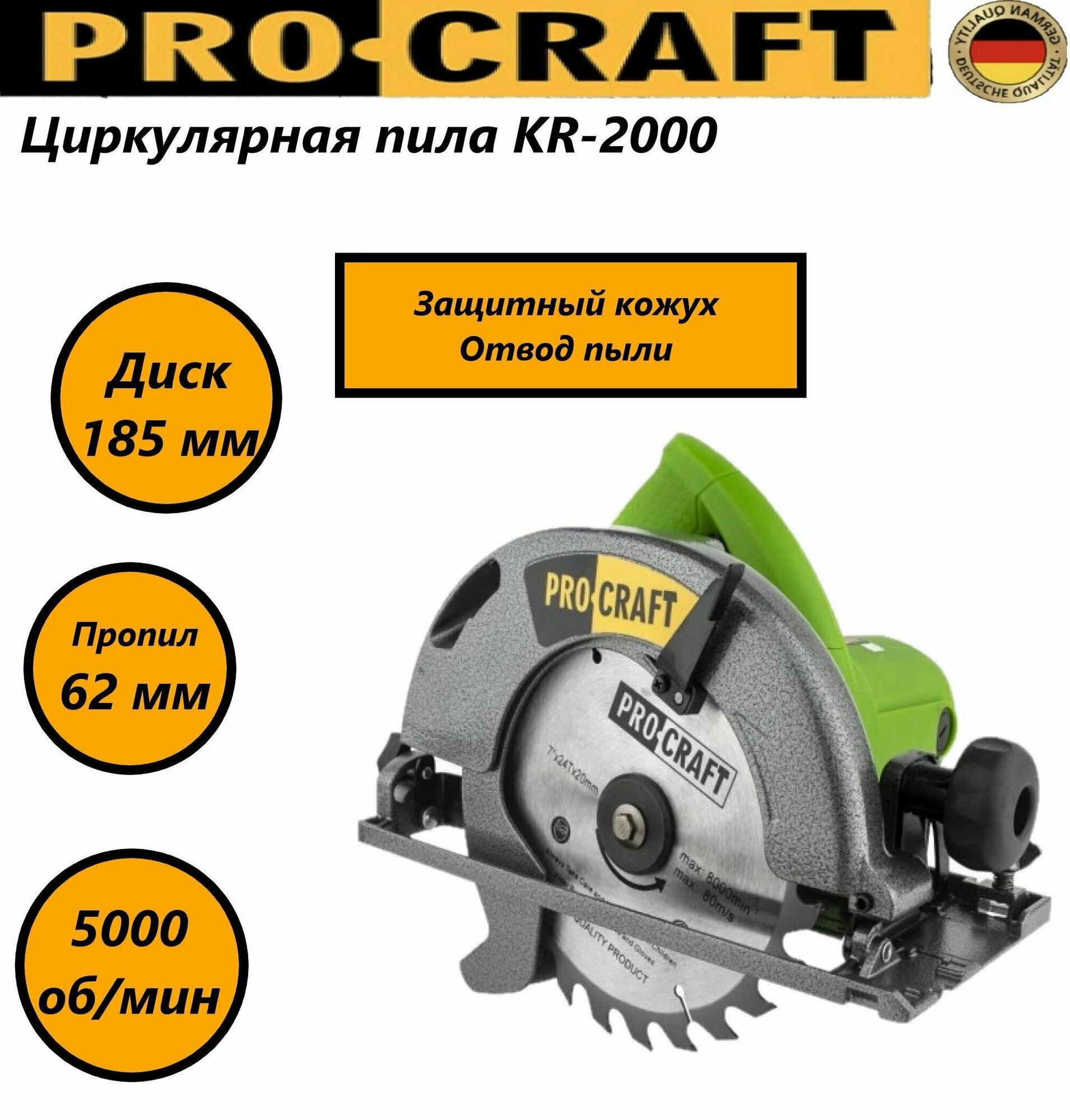 Циркулярная пила дисковая ProCraft KR2000 диск 185мм, пропил 62мм, 5000об/мин, 2000Вт