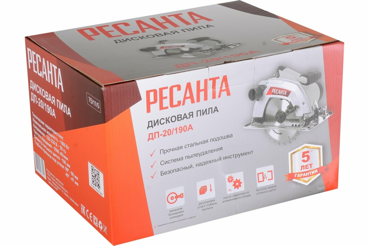 Циркулярная пила (дисковая) Ресанта ДП-20/190А, ручная, мощность 1800Вт, 5500об/мин, диаметр диска 190 мм, глубина пропила до 68мм, (75/11/5)