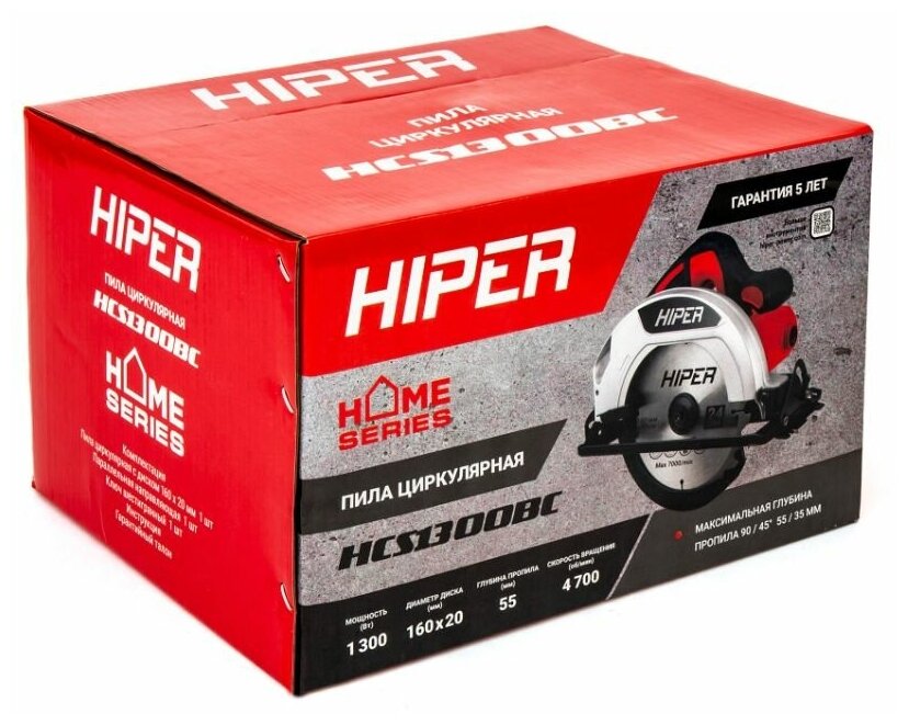 Пила циркулярная HCS1300BC 160х20мм, 1300Вт, 4700 об/мин, глубина пропила 55мм HIPER