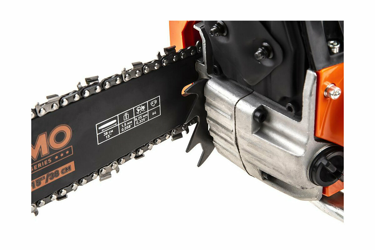 | Особенности | 2-х тактный двигатель с воздушным охлаждением; топливо: смесь бензина АИ 92 и масла для двухтактных двигателей в пропорции: 30 мл масла на 1 л бензина, масло для топливной смеси: масло для 2х-тактных двигателей малого объема с воздушным охлаждением, расход топлива: 1,07 л/ч; толщина паза шины: 1,5 мм; 64 ведущих звеньев; система режимов работы «зима/лето»; габариты упаковки: 495х255х285 мм |