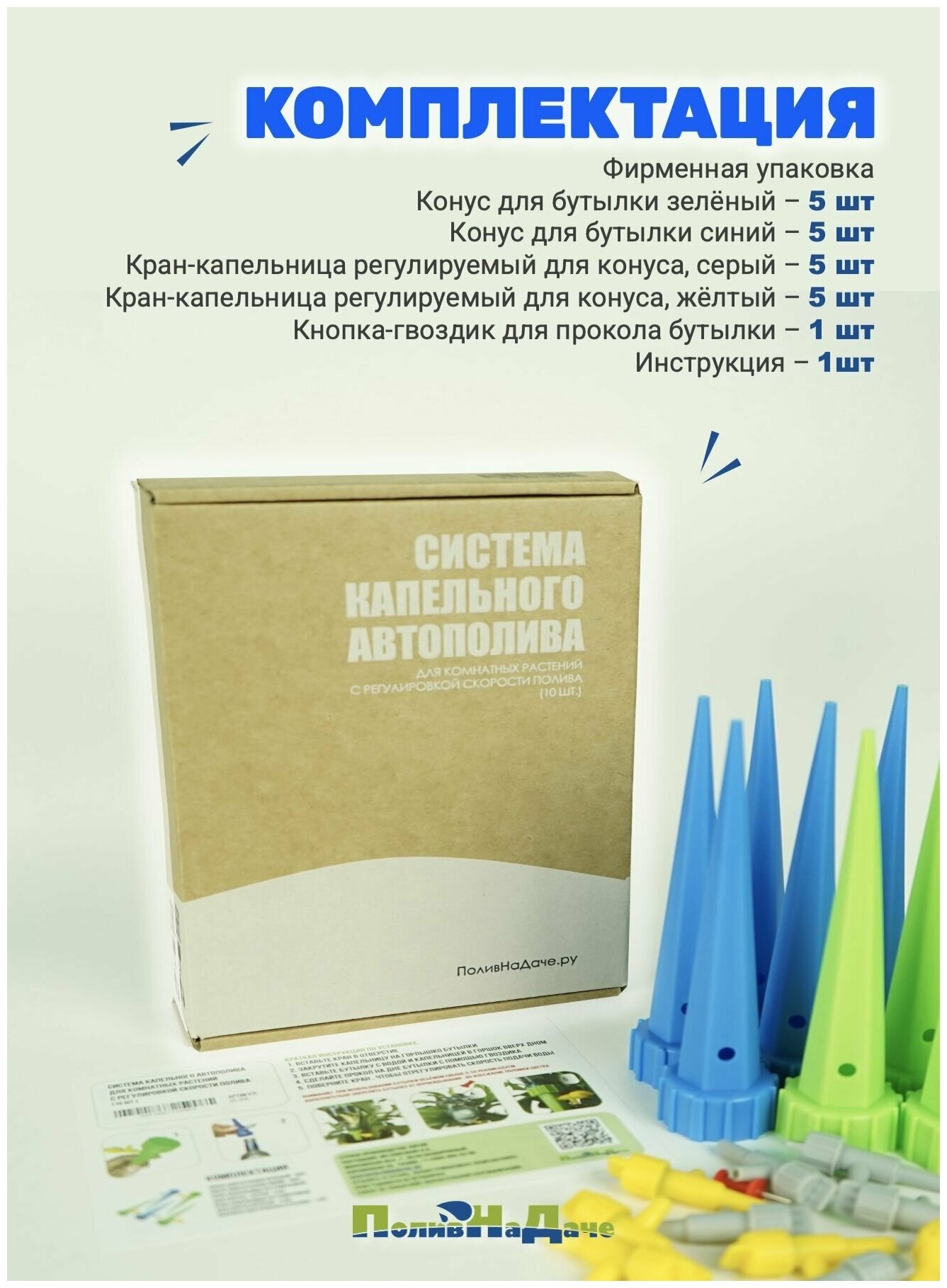 | Комплектация | конус для бутылки зеленый - 5 шт; конус для бутылки синий - 5 шт; кран-капельница регулируемая для конуса, серая- 5 шт; кран-капельница регулируемая для конуса, желтая - 5 шт; дырокол для прокола бутылки - 1 шт; инструкция - 1 шт. |
