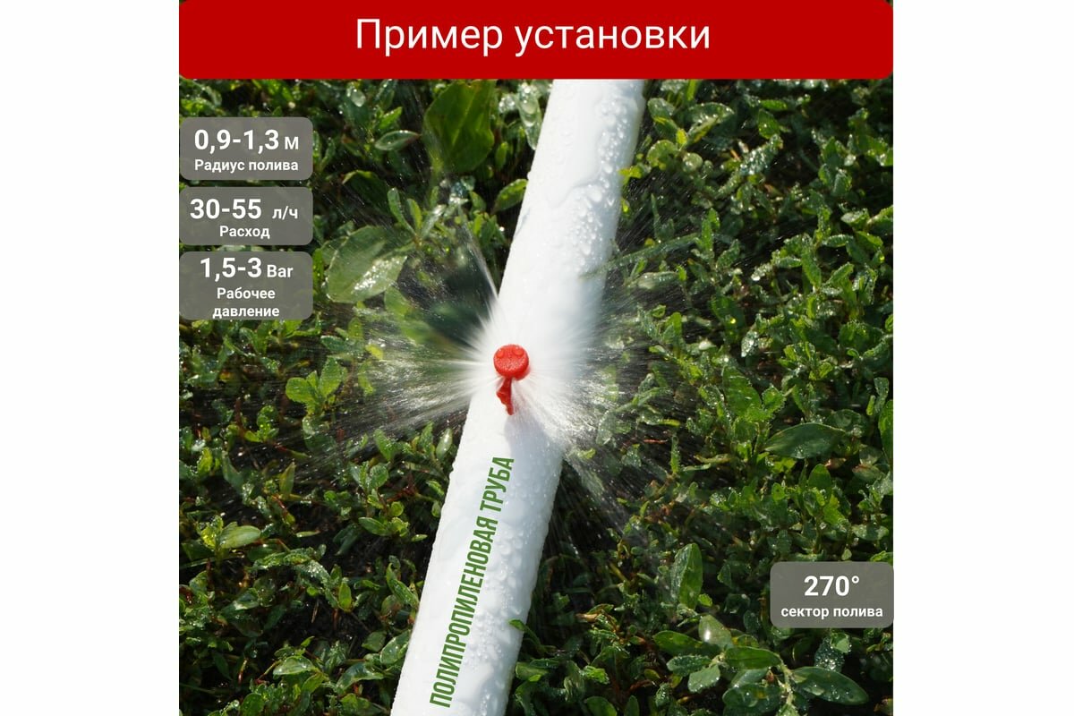 СохранитьМикроджет рефракционный, сектор полива 270 градусов, красный, радиус 0,9-1,3м, расход 30-50л/ч при давлении 1,5-3 bar (100 шт) интересное: