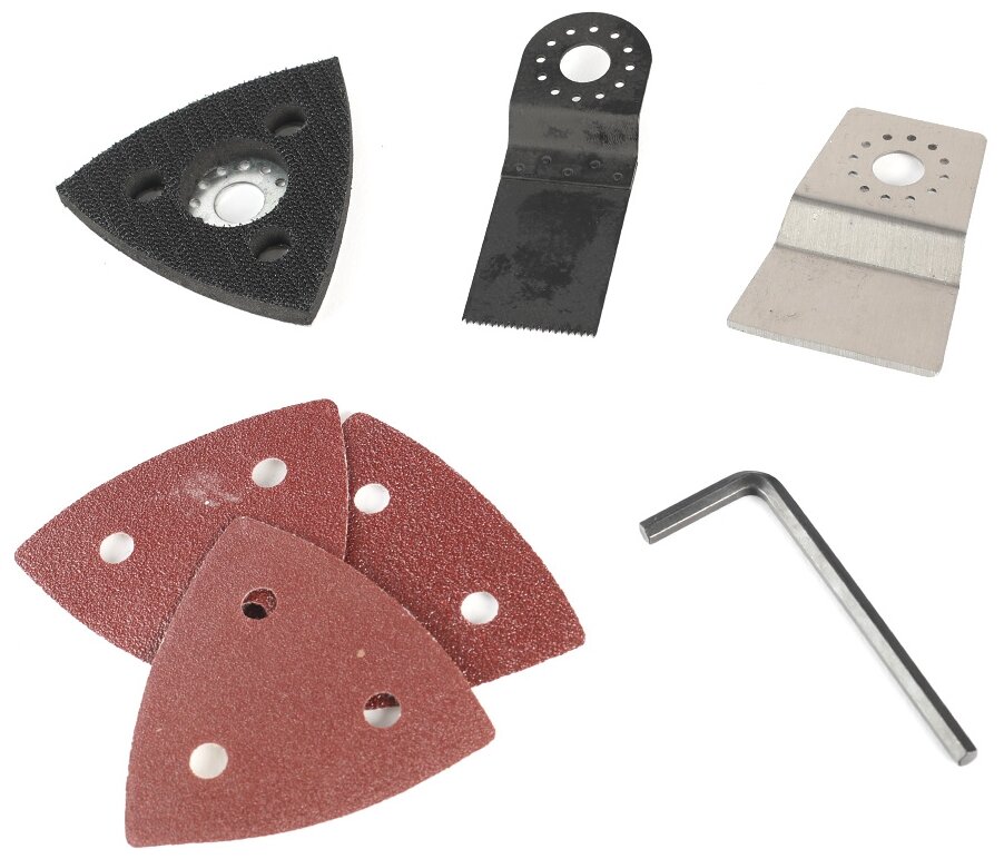 | Комплектация | шлифовальная плитка для шкурок, шлифовальная бумага, прямой резак по дереву, скребок, ключ шестигранный, адаптер для подключения к пылесосу, инструкция |