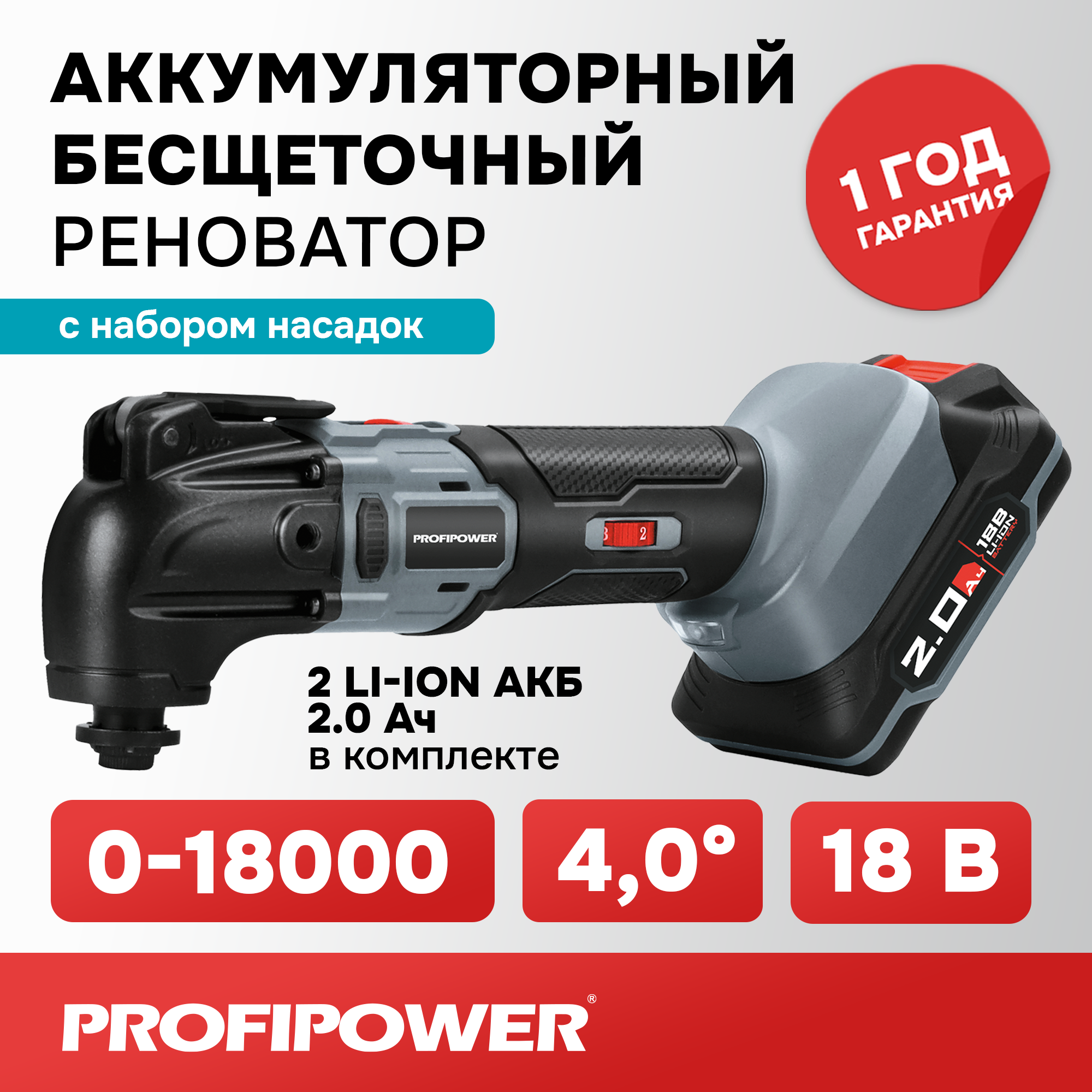 Аккумуляторный реноватор ProfiPower MKDTM-18V (Li-ion-2шт,2.0Ач, 0-18000кол/мин,4,0°,насадок 6шт, З/У,в коробке)