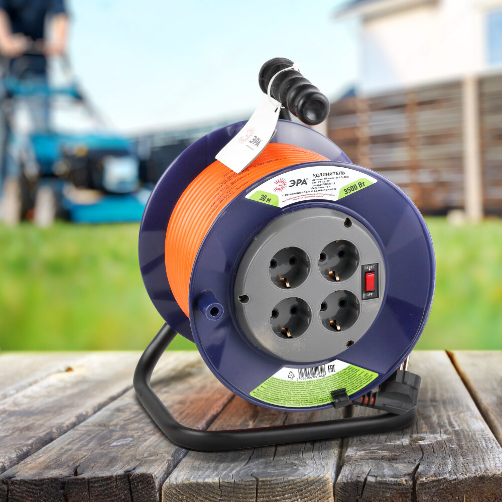 Удлинитель силовой на катушке ЭРА RPx-4es-3x1.5-20m с заземлением, провод ПВС 3х1.5мм2, 4 розетки, 20м, Б0046849 / электрика
