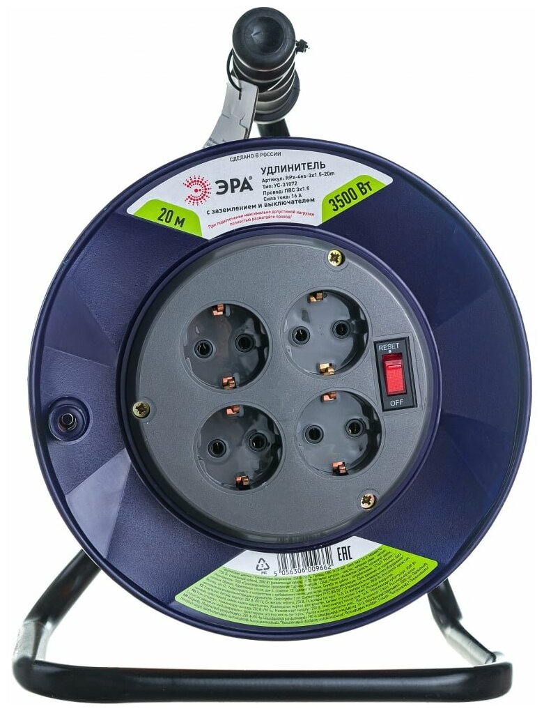 Удлинитель силовой на катушке ЭРА RPx-4es-3x1.5-20m с заземлением, провод ПВС 3х1.5мм2, 4 розетки, 20м, Б0046849 / электрика