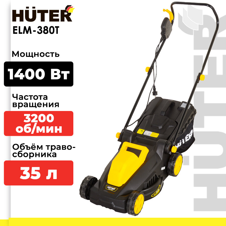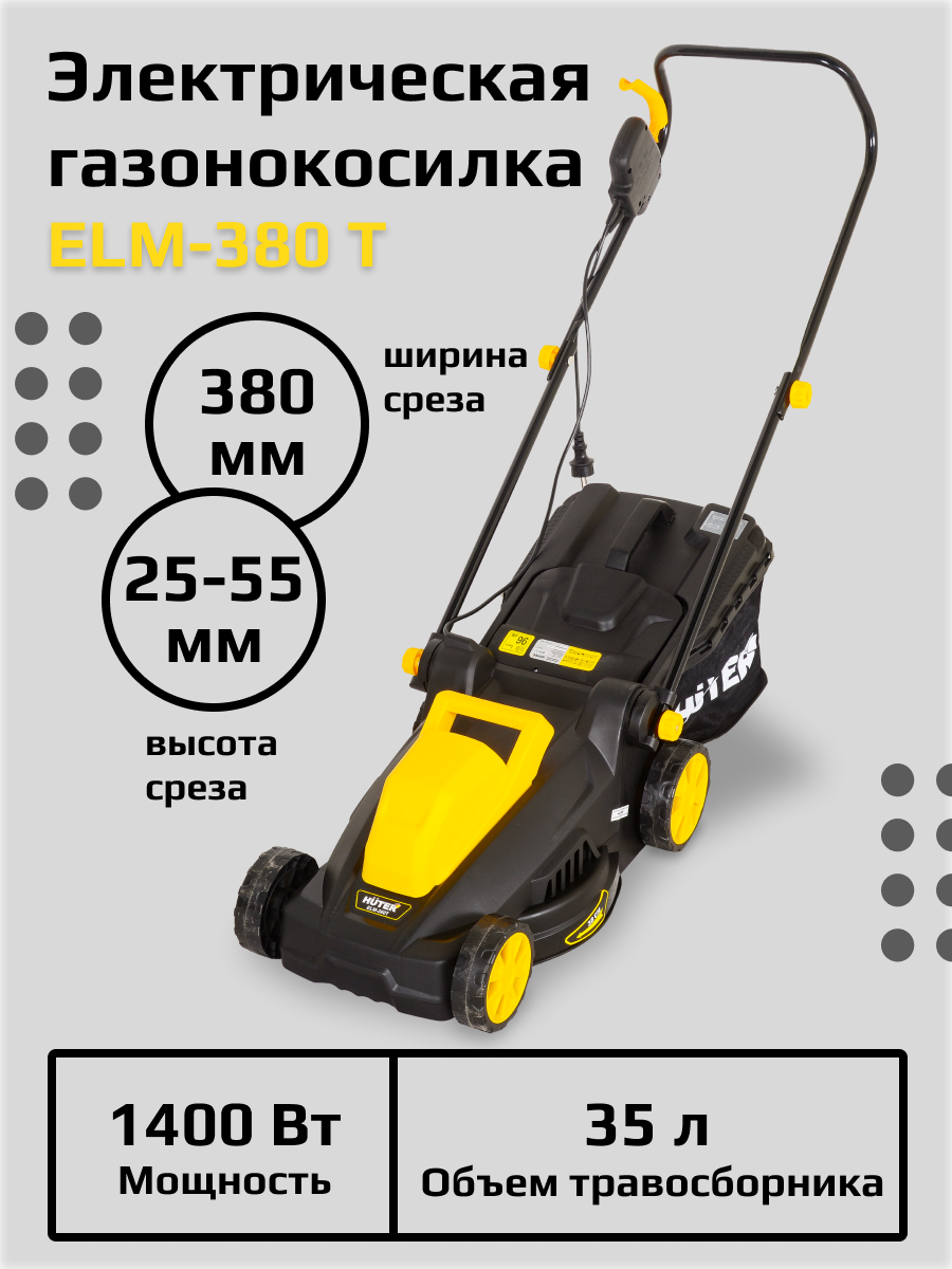 | Комплектация | , Преимущества Huter ЕLM-380T: надежный и производительный электродвигатель, работающий от электрической энергии; широкий диапазон среза и большой охват территории, возможность регулировать высоту обработки травы; корпус сделан из легкого и прочного пластика; емкость для сборки травы позволяет работать на протяжении длительного времени без перерыва; нож сделан из прочной и долговечной стали. |