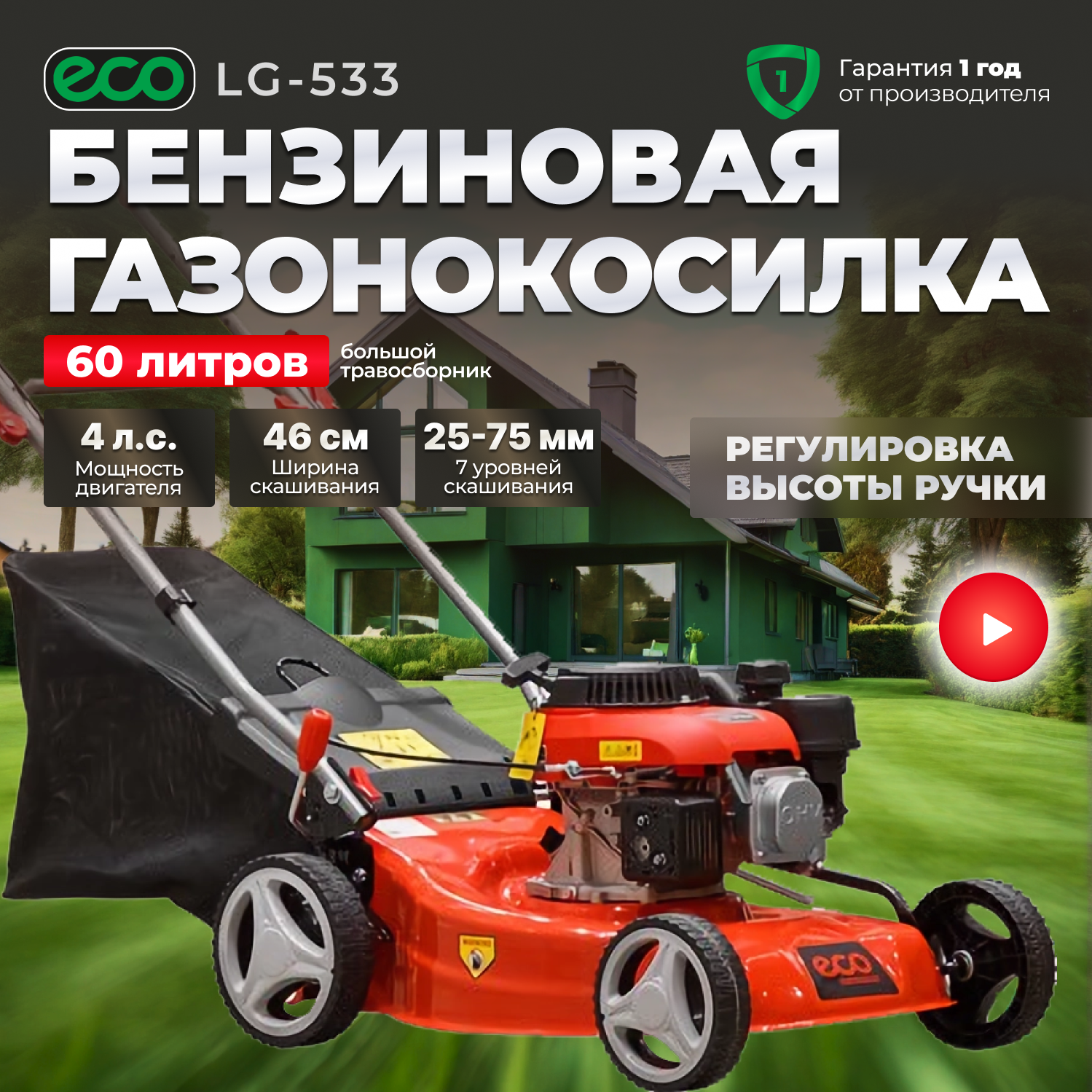 Газонокосилка бензиновая ECO LG-533 (4.0 л.с., шир. 46 см, ручной привод, стальн. корпус, травосборник 60 л) (LG-533)