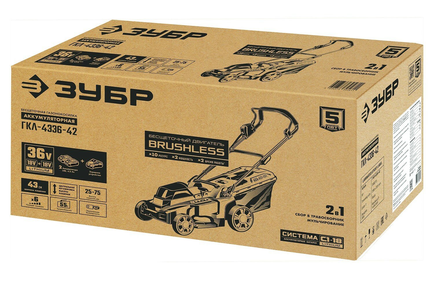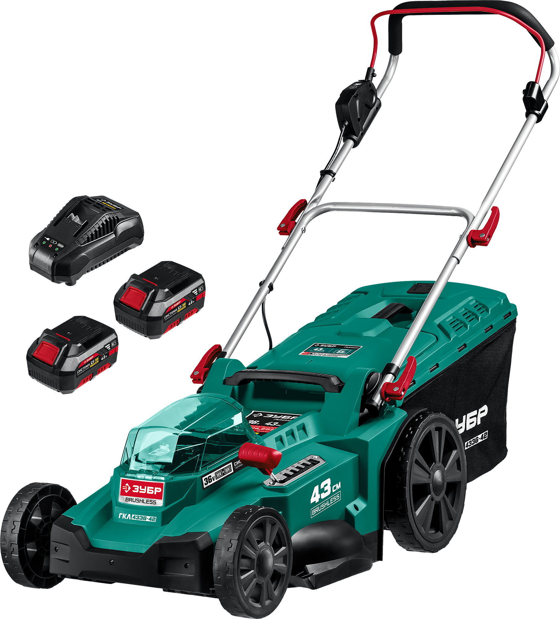 ЗУБР С1-18, 36 В, 43 см, 2х18 В АКБ (4 Ач), бесщеточная газонокосилка (ГКЛ-4336-42)