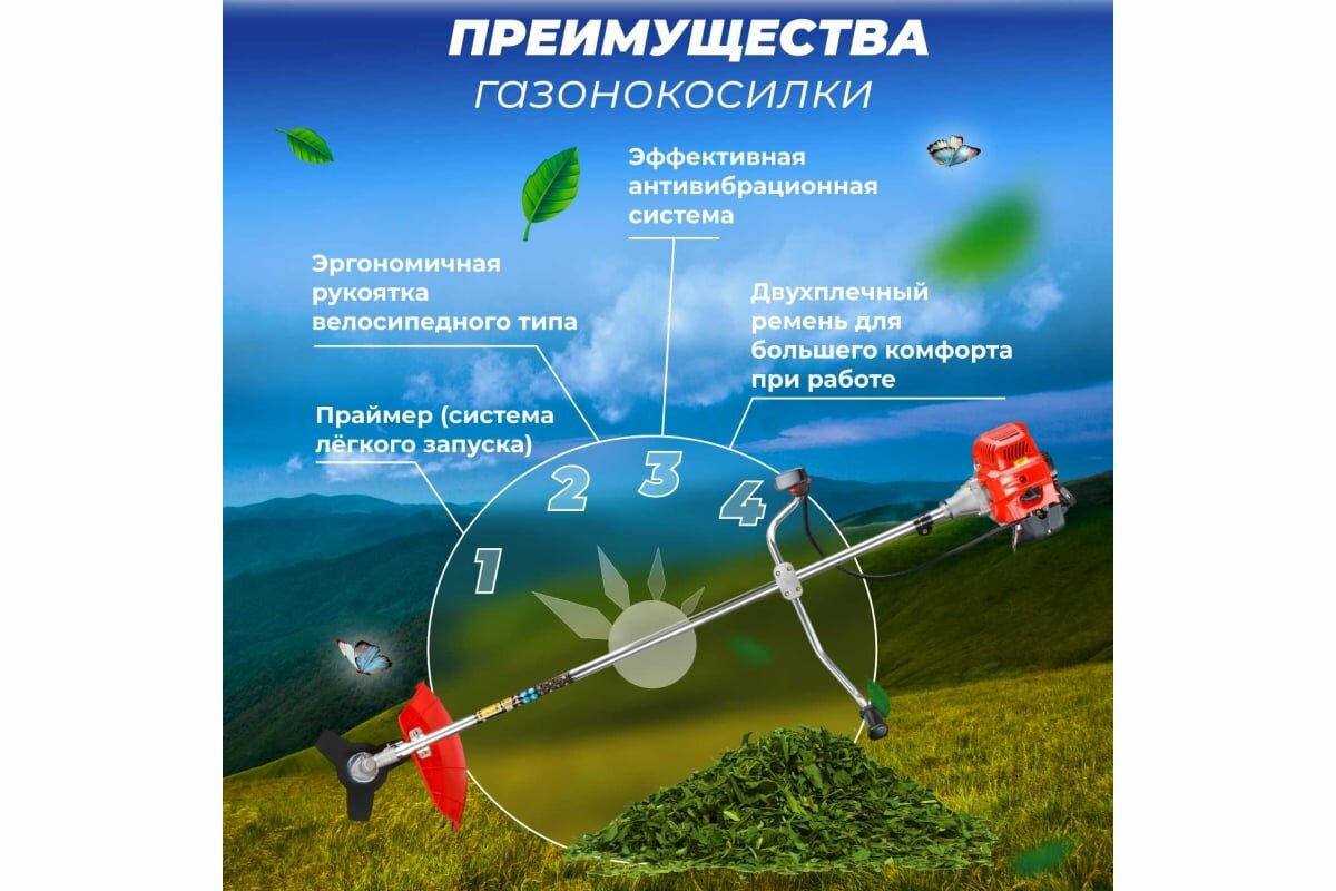 | Плюсы: | всё, что нужно для того чтобы начать покос имеется в комплекте (кроме, разумеется, топлива-масла, тут уж самим)