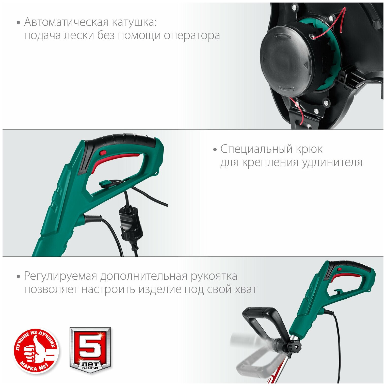 1. Очень мощный для электрического триммера (живу в своем доме почти 15 лет - есть с чем сравнить) 2. Огромное количество индивидуальных настроек (повороты ручек, регулировки по высоте, наклон режущего блока и т.д.) для использования. Человеку ростом до 190 пользоваться очень удобно. Плюс ограничители для стрижки около бордюров - работают как надо. 3. Отдельная сказка - автоматическая подача лески. Каждый раз при работе возникает мысль - чего-то уже плохо стрижет - надо поменять леску. И ведь лень - да ладно достригу. А тут как будто только что зарядил - весь процесс идет мощно и максимально эффективно. 4. Толщина лески и мощность позволят убирать практически любые запущенные участки . |