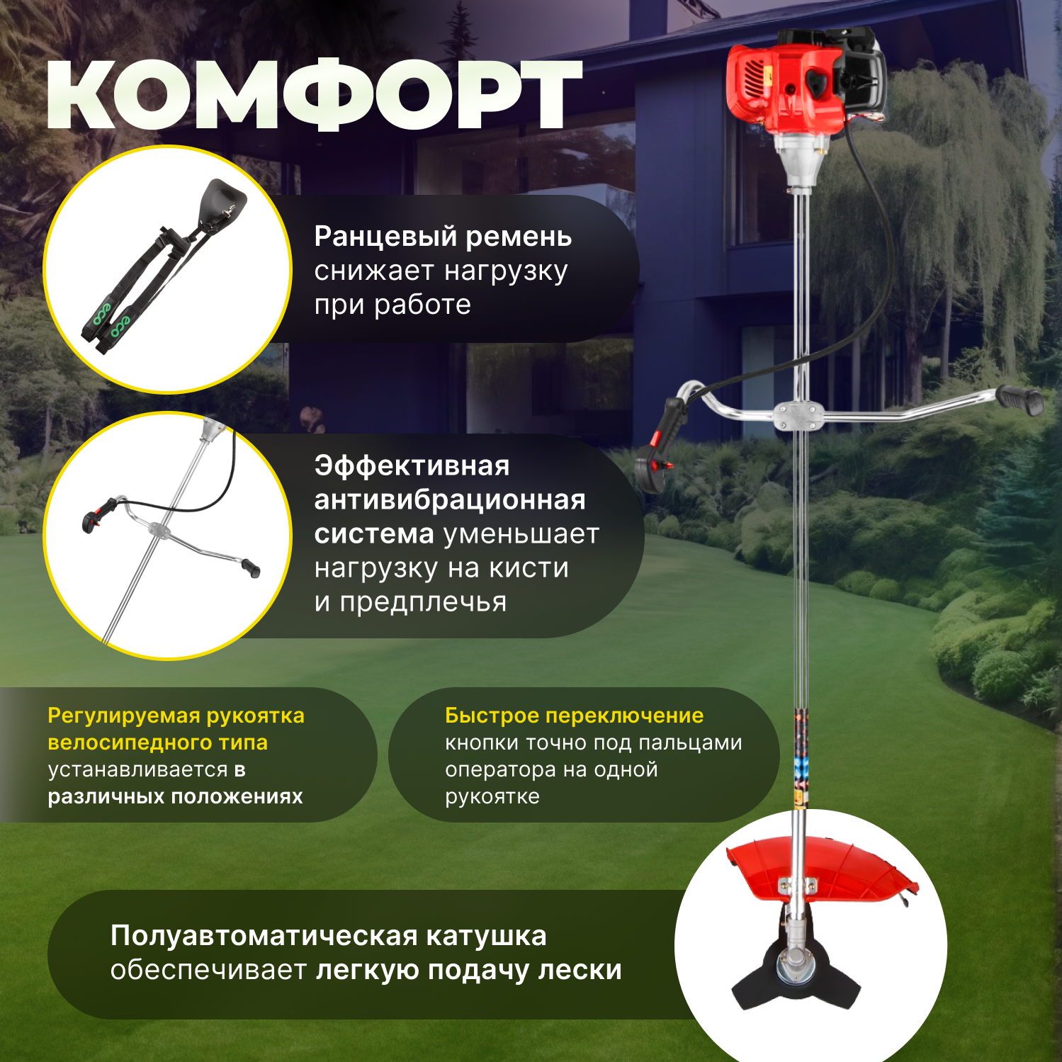 | Отзыв: | Коса реально удобная. Ею можно косить долго, не устают ни руки, ни поясница. Лямки не натирают, т.к. сдвоенные. Держать удобно, никаких усиленных вибраций не наблюдается.