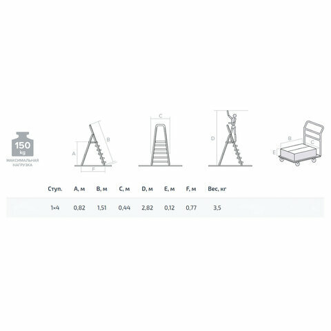 Стремянка алюминиевая 4 ступени, высота площадки 0,82м, дуга безопасности 0,6м, площадка 26х26см, до 150кг, вес 3,5кг, новая высота