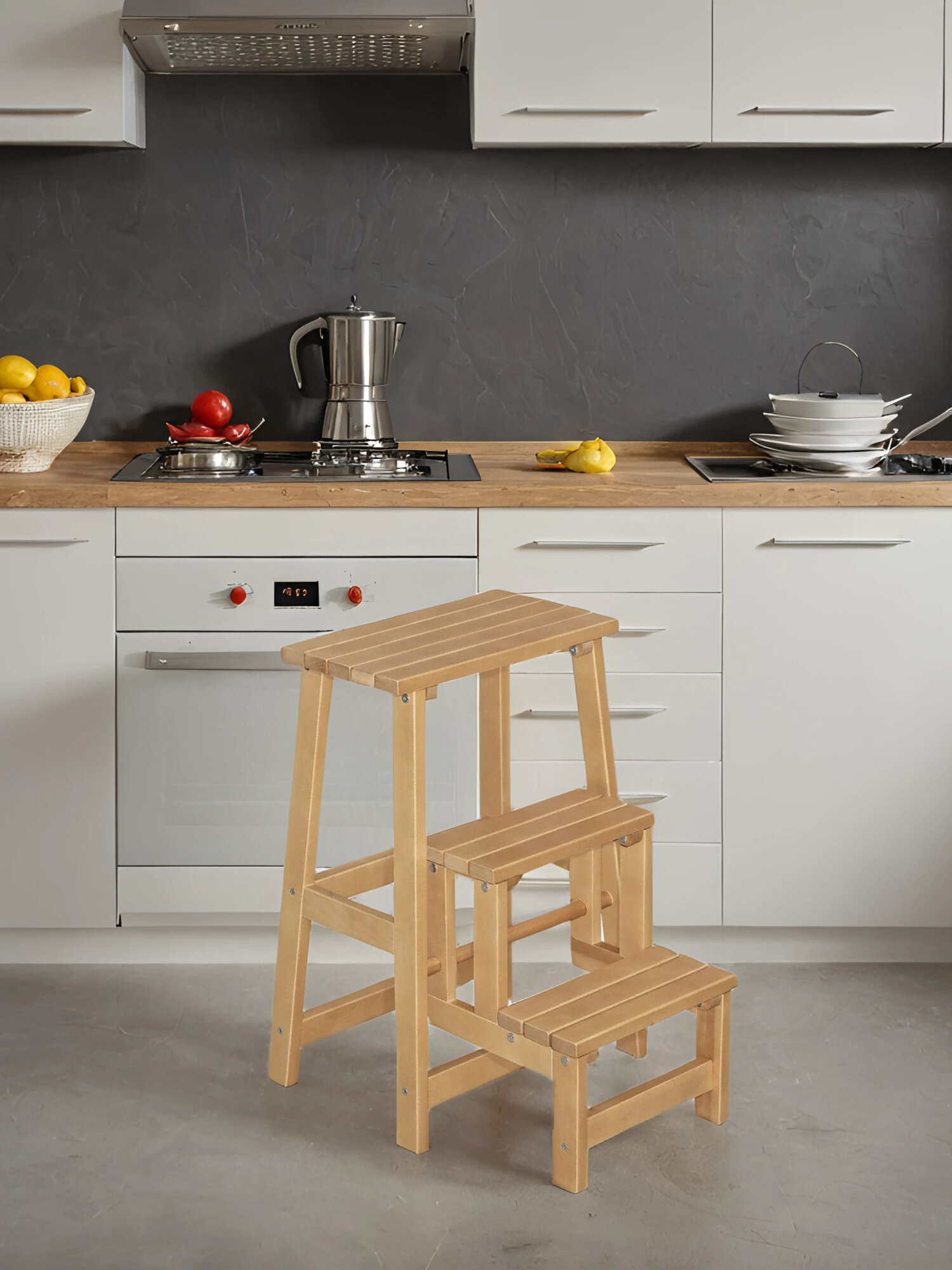 | Плюсы: | Красивая незаменимая стремянка на кухне да и вообще в квартире. Компактная, покрыта лаком, легко оттирается грязь. |