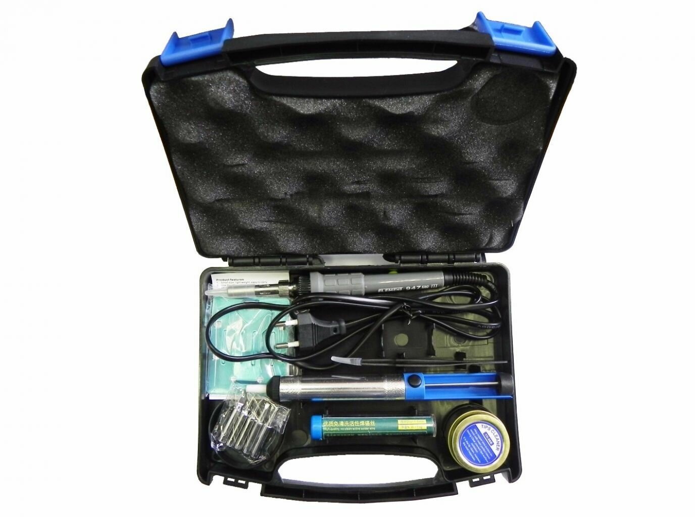 | Комплектация | очиститель, пинцет, экстрактор припоя, 5 сменных жал, подставка для паяльника, кейс, канифоль, припой, руководство пользователя |