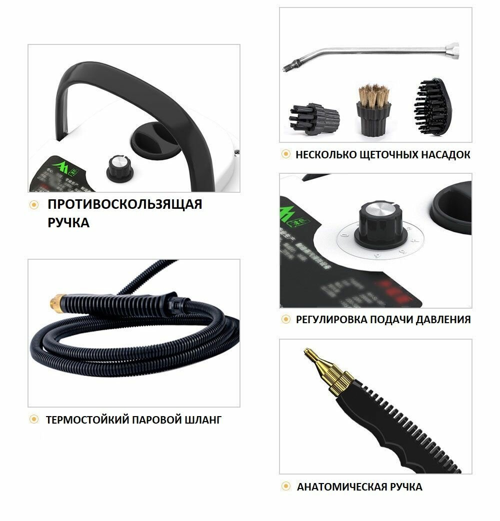 | Плюсы: | Довольно мощная струя пара, удобный, длинный шланг и металлический носик, несколько насадок. |