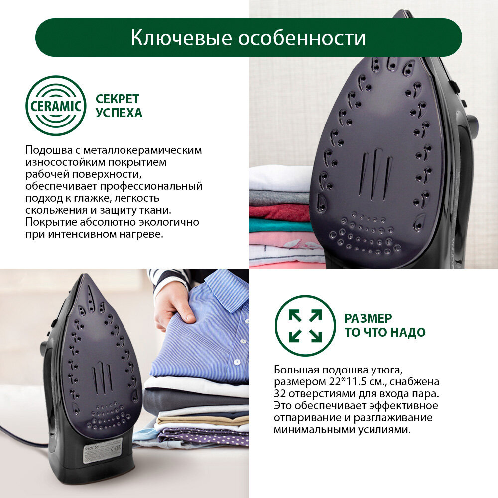 | Дополнительная информация | напряжение: 230 Вольт, 50 Герц; материал корпуса: пластик; тип управления: механическое; покрытие рабочей поверхности: металлокерамика, количество отверстий для пара: 19; предохранение шнура от перекручивания; мерный стакан в комплекте; подходит для синтетики, шелка, шерсти, хлопка, льна; световой индикатор нагрева |