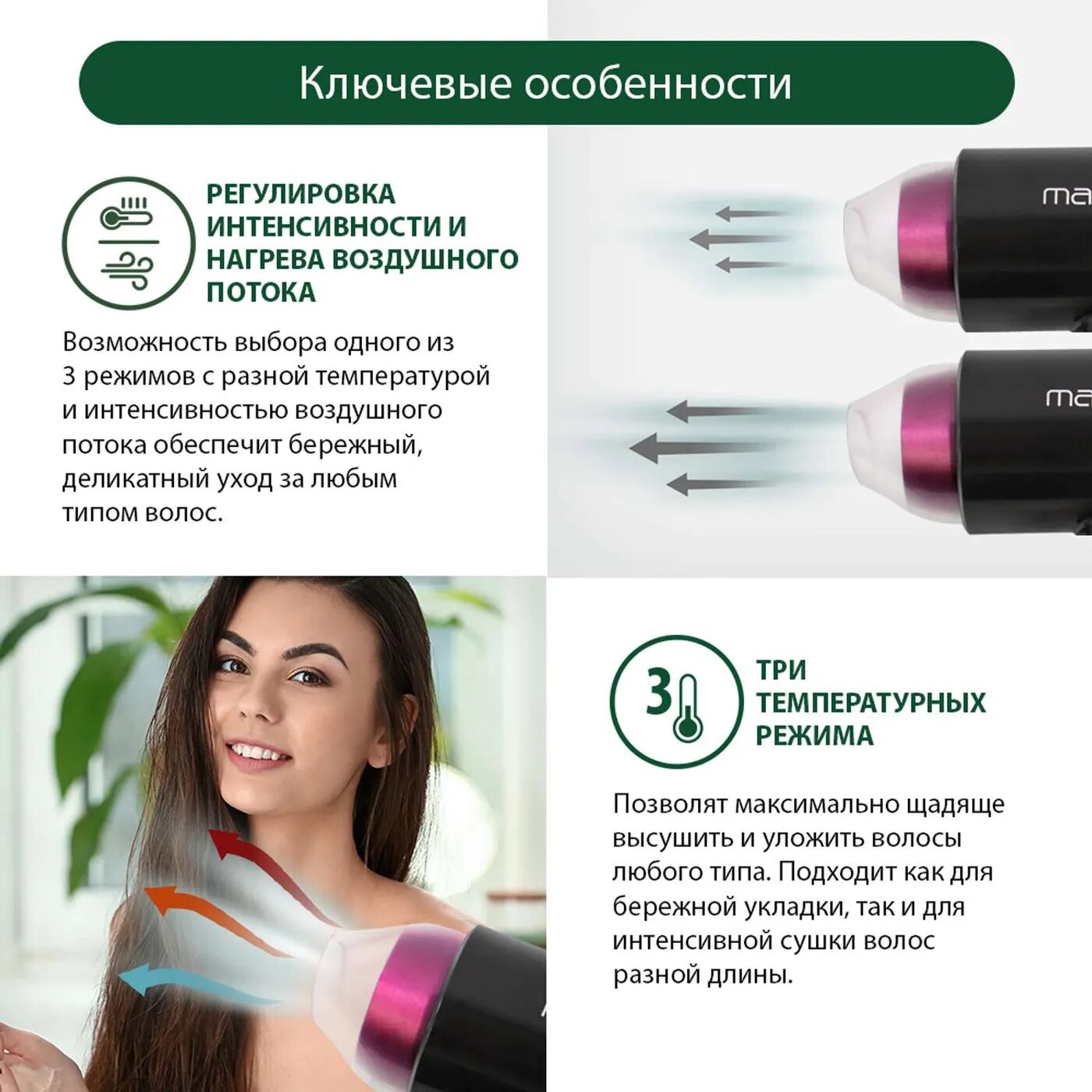 | Плюсы: | Не портит волосы, быстро сушит, есть несколько режимов |