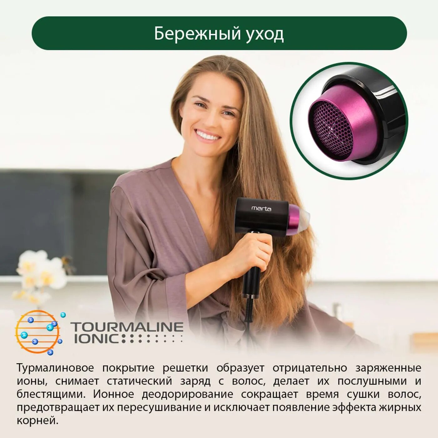 Фен MARTA MT-1263 Технология tourmaline ionic светлый чароит