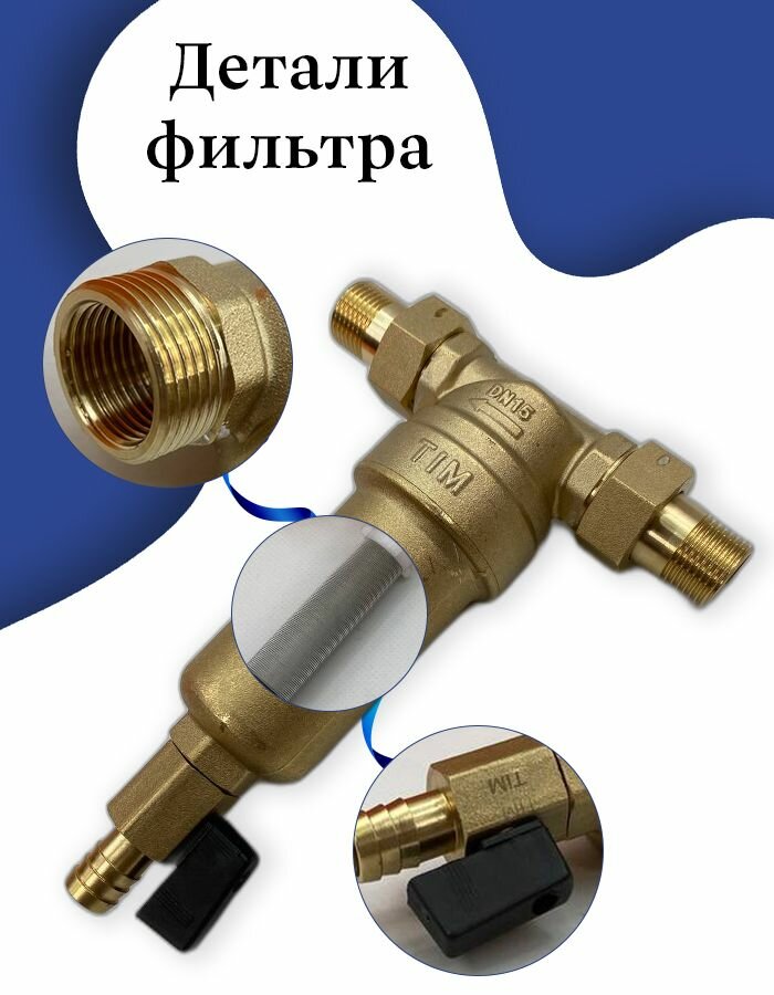 Фильтр самопромывной 1/2" НН с американками и сливным краном, латунный корпус TIM арт. JH-1003Y2
