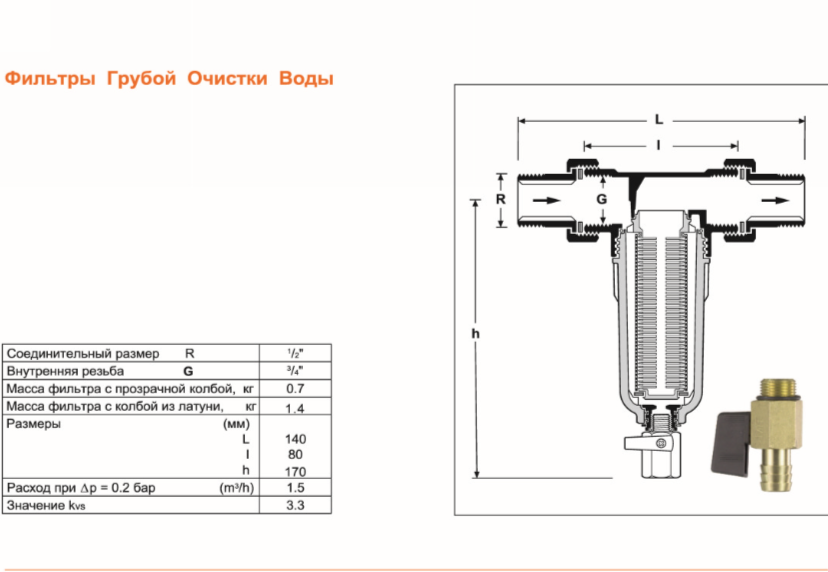 | Дополнительная информация | высота, мм 158; толщина, мм 140, размер резьбы 1/2"; материал фильтроэлемента - металлическая сетка; производительность 1,5 м3/час |