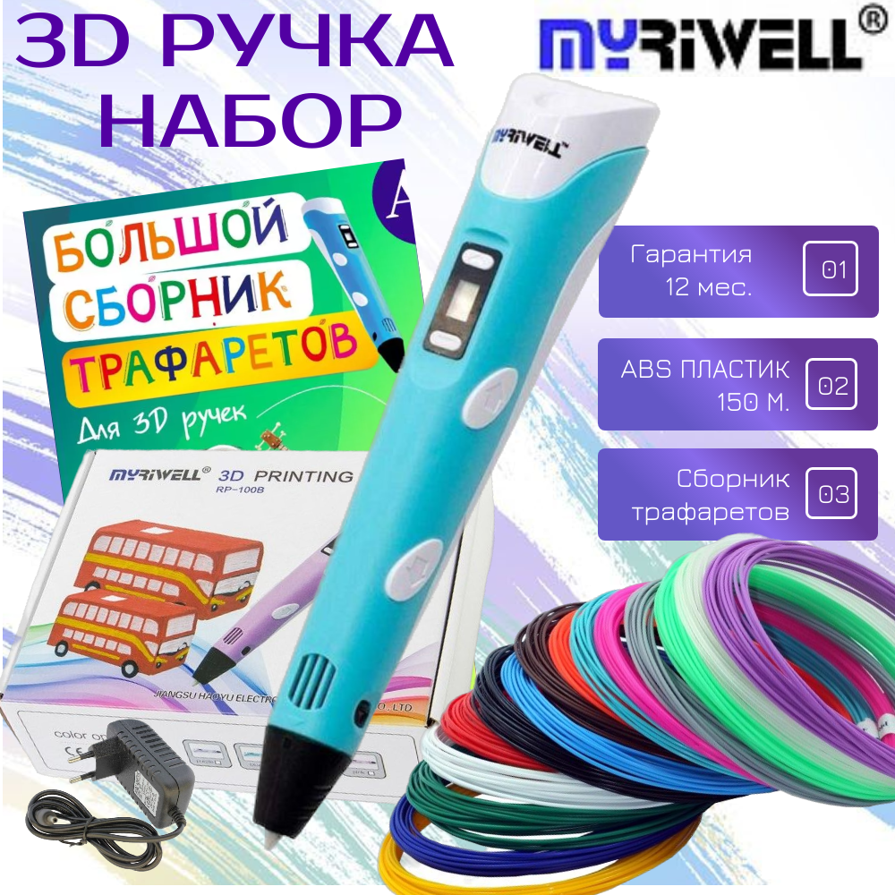Купить 3D ручка MyRiwell с комплектом пластика ABS 150м/ Книжка с трафаретами/Прозрачный коврик/Цвет голубой
