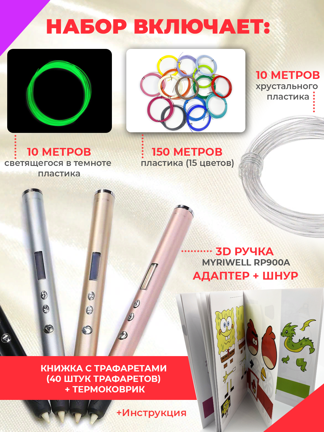 3Д ручки Myriwell 3D ручка Myriwell RP900A + 170 м пластика + книжка с трафаретами (40 штук)