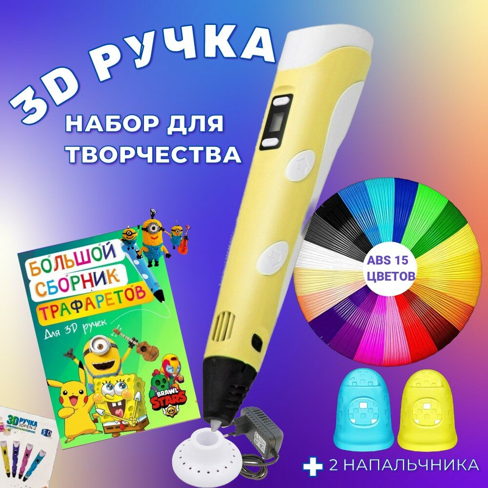 3D ручка с комплектом пластика ABS 150м/Книжка трафаретов/Прозрачный коврик. Цвет желтый. интересное: