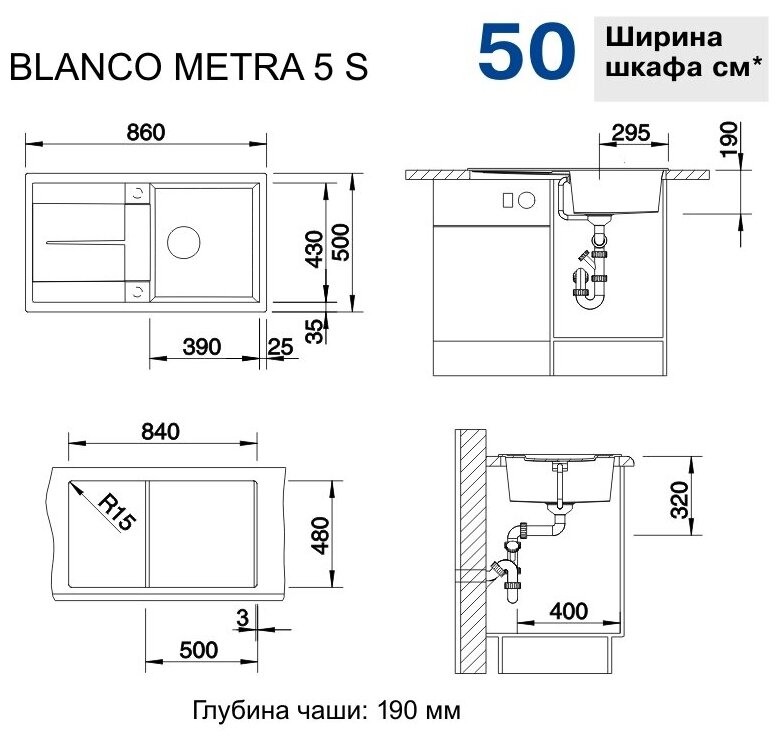 | Глубина мойки | 50 см |